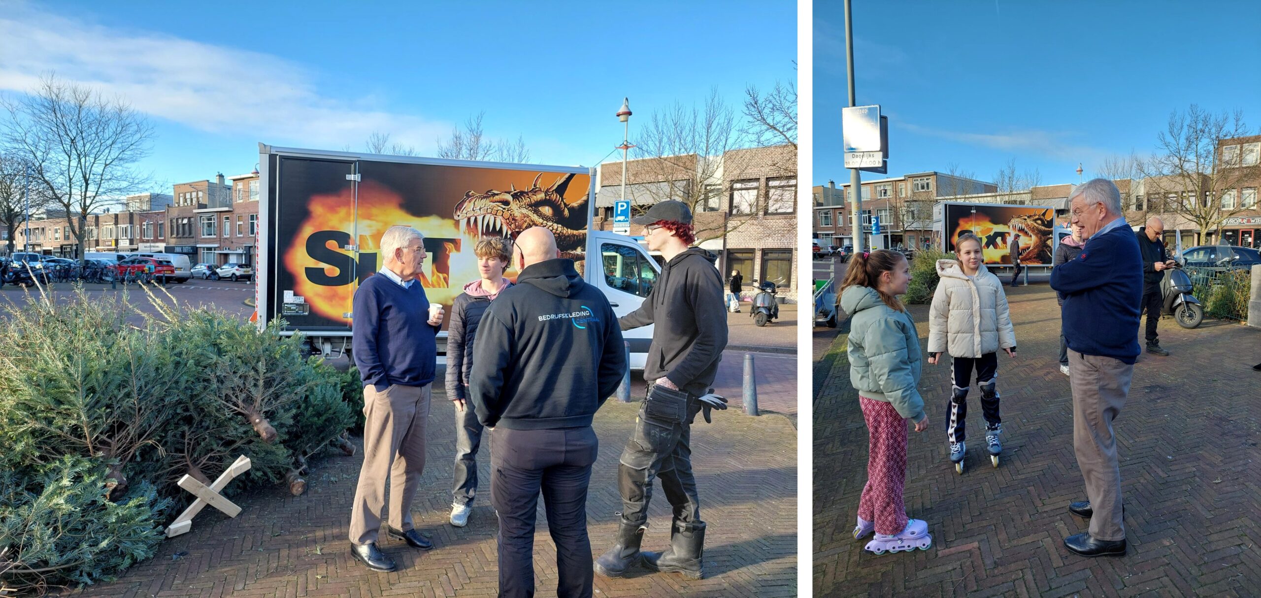 Groet Salvador en Roman die aanspreekpunt zijn bij het verzamelpunt, en Emma en Fleur die hun eerste boom inleveren. Zing Yasmina, de 21-jarige werkstudent bij directie Veiligheid én vandaag jarig, toe en wens iedereen succes bij de inleveractie. Vorig jaar zijn er 56.000 bomen ingezameld, hopelijk dit jaar nog meer.