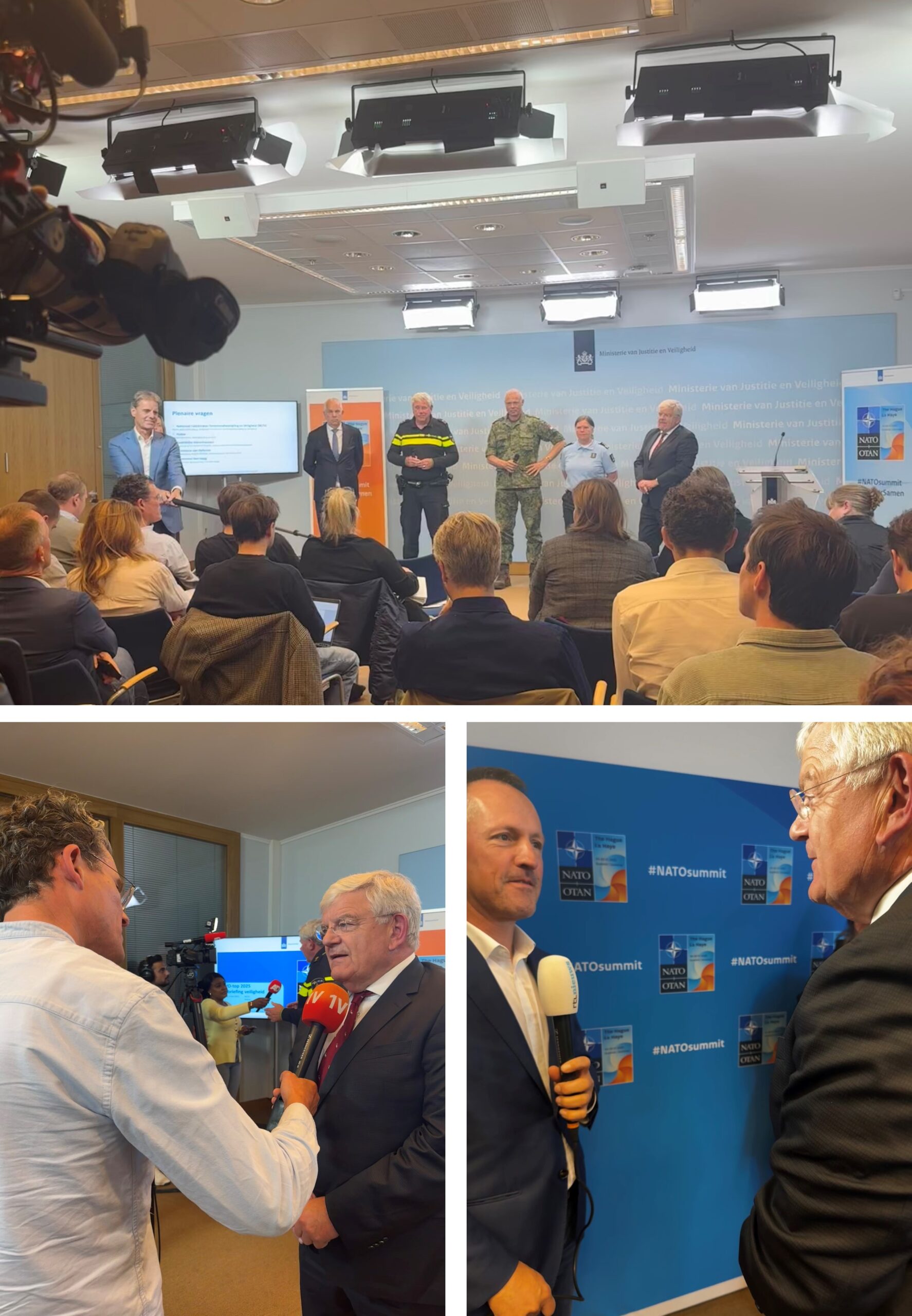 Wandel met projectdirecteur NAVO-top Peter van Heerwaarden en woordvoerder Sentina van der Meer vanuit het Stadhuis naar het ministerie van Justitie en Veiligheid. Draag bij aan een bijeenkomst met de media over de landelijke veiligheidsmaatregelen rond de NAVO-top op 24 en 25 juni. Jacquelien Nienhuis (ministerie van Buitenlandse Zaken) treedt op als ‘dagvoorzitter’. Om de top veilig, waardig, gastvrij en ongestoord te laten verlopen werken veel organisaties samen. De Nationale Coördinator Terrorismebestrijding en Veiligheid (NCTV) Pieter Jaap Aalbersberg trapt af, daarna volgen de projectleider van de politie Willem Woelders, luitenant-generaal Annelore Roelofs van de Koninklijke Marechaussee en generaal-majoor Wilfred Rietdijk van Defensie. Allen lichten de inzet van hun diensten toe. Indrukwekkend. Krijg zelf het slotwoord. Geef aan wat de maatregelen betekenen voor Den Haag. Het is een eer dat de NAVO-top in onze stad van vrede en recht wordt gehouden, maar ook een grote verantwoordelijkheid. Het pakket veiligheidsmaatregelen zorgt voor overlast. Ondertussen moet het maatschappelijk en economisch verkeer zoveel mogelijk doorgaan. Daarover spreken we als gemeente met de veiligheidsdiensten. Dat doen we ook met bewoners, ondernemers, scholen, zorginstellingen en andere betrokkenen. Via informatiebijeenkomsten groot en klein, met één-op-één gesprekken en bijvoorbeeld tijdens het wekelijkse inloopspreekuur (elke woensdagmiddag in restaurant Gember bij het Fotomuseum). Geef na afloop van de persbriefing interviews aan het AD, De Telegraaf, RTL Nieuws, de NOS en het Jeugdjournaal.