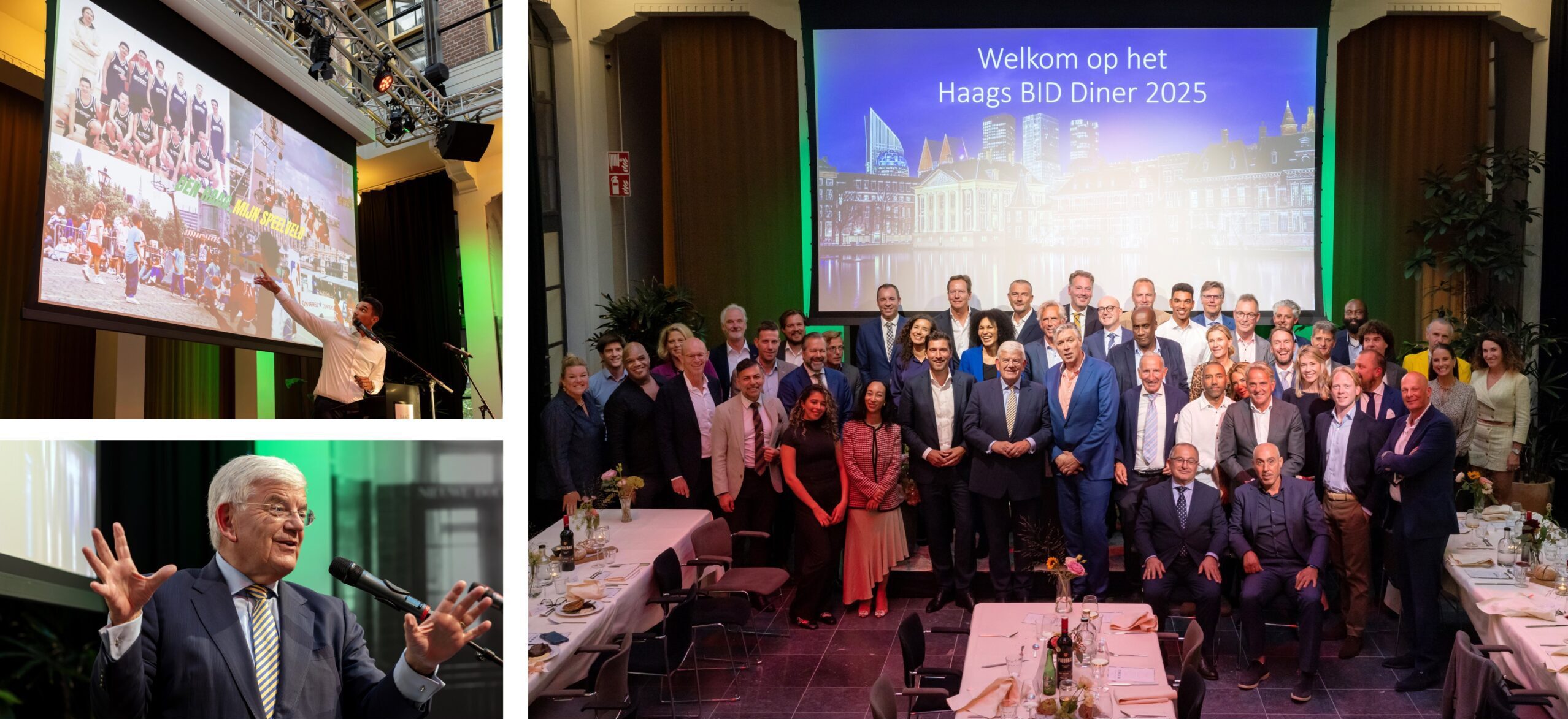 De avond staat in het teken van de jaarlijkse Haagse BID-bijeenkomst in het Nutshuis, een prachtig historisch pand aan de Riviervismarkt. Bewonder bij binnenkomst de hal van de (voormalige) bank. De tafels staan gedekt klaar. Begroet Ralph van Essen – ooit de initiator van de Big Improvement Days (BID) – en columnist en cabaretier Sjaak Bral. Verheug me op een inspirerende avond met ondernemende stadgenoten. Beluister bijvoorbeeld met veel plezier het verhaal van Olympisch kampioen Arvin Slagter. Hij vertelt over zijn ervaringen met het 3×3 basketbalteam in Parijs. Hij heeft zijn gouden medaille te danken aan het talent van Den Haag en de Haagse sportvelden. Arvin vergat onderweg naar de belangrijkste wedstrijd van zijn leven zijn basketbalschoenen… maar werd door teamwork en vertrouwen in de ander toch Olympisch kampioen. Geloof net als Arvin dat sport verbindt en dat er door ‘samen doen’ meer mogelijk is, ook al is dat op een slof en een oude basketbalschoen.