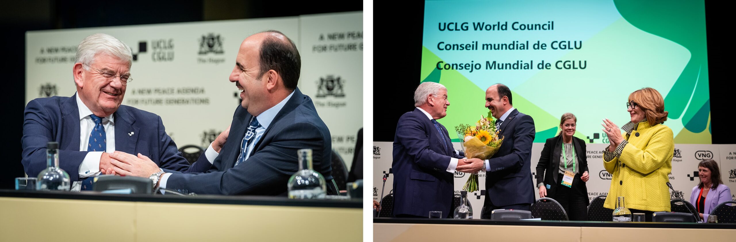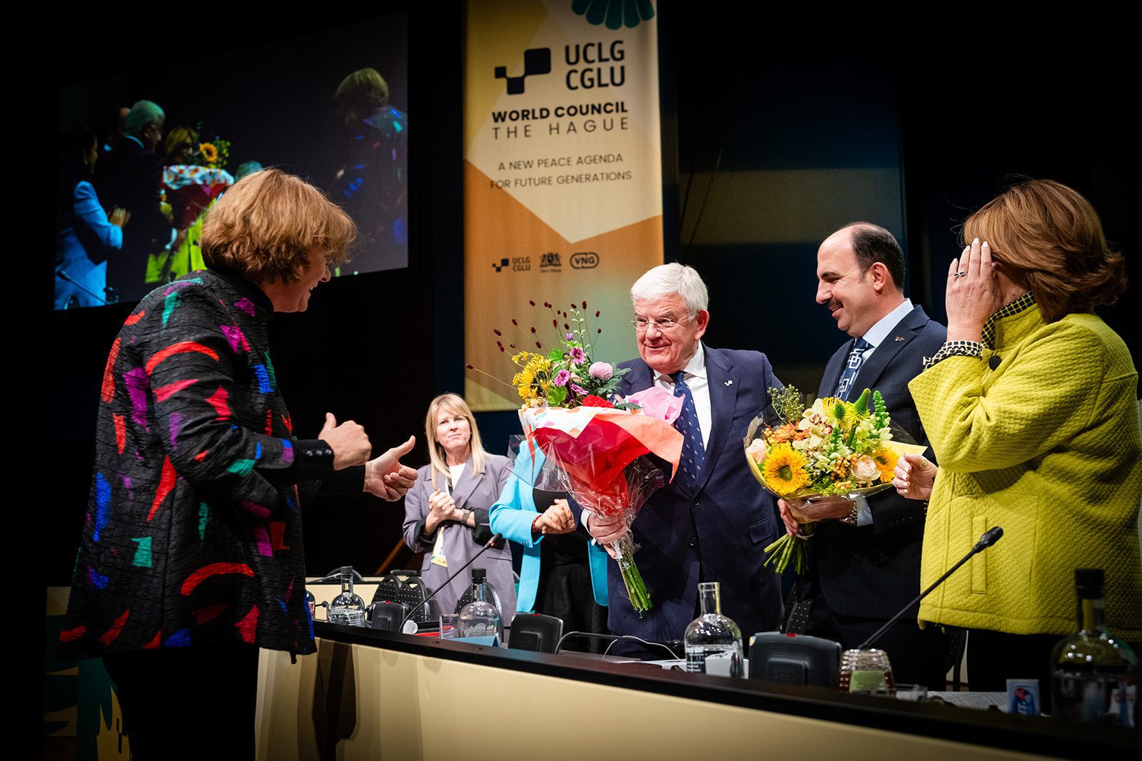 Het is zover. President Altay draagt het stokje aan mij over. Spreek de leden van de World Council toe over mijn motivatie om dit werk te doen en de prioriteiten voor de komende tijd. Ontvang na afloop allerlei gelukwensen en namens de VNG bloemen uit handen mijn Nederlandse ambtgenoot Wobine Buijs (Oss).