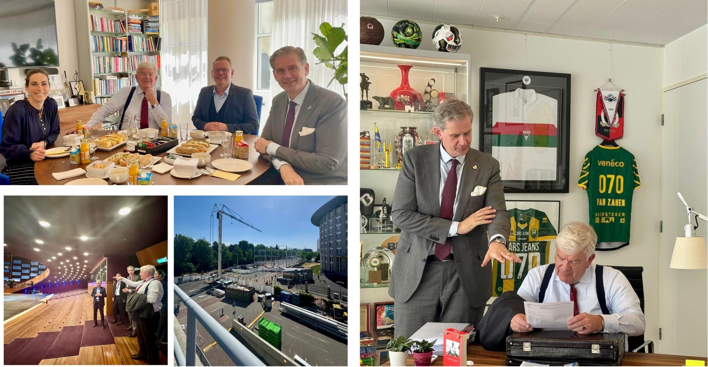 Ontvang, terug op het Stadhuis, commissaris van de Koning Wouter Kolff. Woordvoerder Jeroen Kon vergezelt hem. De commissaris is sinds 1 september in dienst. Hij maakt een kennismakingsronde langs alle 50 Zuid-Hollandse gemeenten. Gebruiken de lunch in mijn werkkamer en gaan vervolgens naar het World Forum. Michiel Middeldorf (general manager World Forum) en Robert Dingjan (operationeel directeur van de taskforce NAVO-top vanuit het ministerie van Buitenlandse Zaken) ontvangen ons. Ze leiden ons rond over het NAVO-top-terrein in wording. Het ziet er indrukwekkend uit. Zo’n 14.000 vierkante meter wordt bijgebouwd. Michiel en Robert tonen de maquette van het uiteindelijke resultaat.