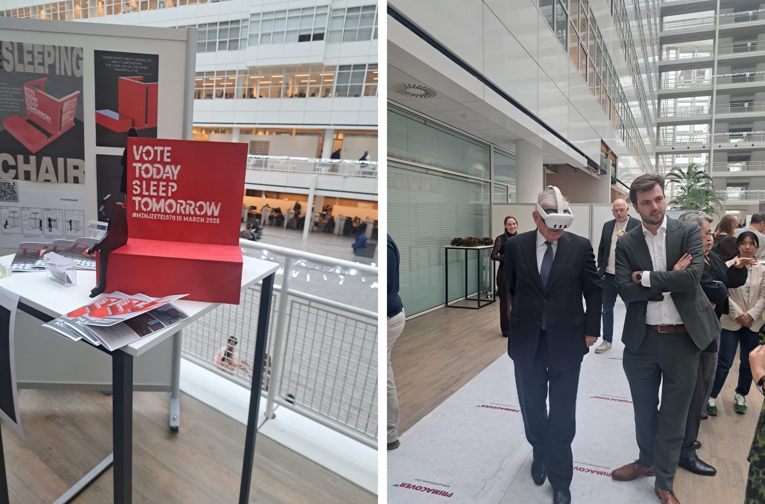 Wandel via de loopbrug naar de overkant van het gebouw en ‘daal’ af naar de eerste verdieping. Op de entresol van de raadsfoyer is een expositie te zien van de maquettes van acht stoelen (‘verkiezingszetels’) die zijn gemaakt ter gelegenheid van de gemeenteraadsverkiezingen 2026. Studenten Industrial design van De Haagse Hogeschool hebben de stoelen ontworpen. Ieder stadsdeel krijgt een eigen zetel. Maak een ronde langs de expositie en maak kennis met de studenten.