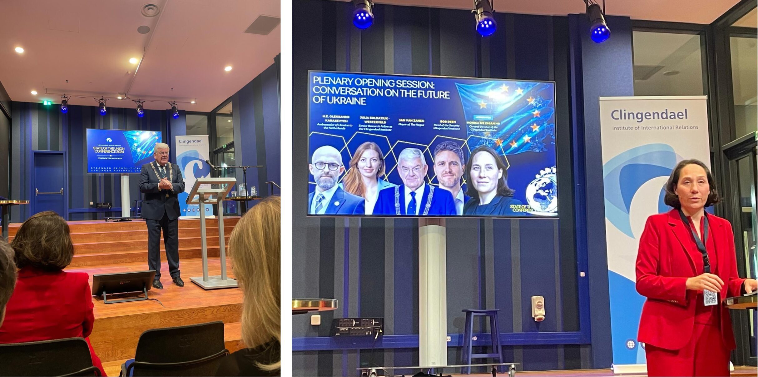Ga aan de wandel. Haast me naar de Salsazaal in Amare voor de jaarlijkse Clingendael State of the Union Conference. De conferentie brengt zo’n 300 geïnteresseerden bij elkaar om te praten over de toekomst van Europa. Open, samen met Monika Sie (directeur Clingendael) en René Cuperus (senior research fellow EU & Global Affairs, Clingendael), de conferentie. Verwelkom de deelnemers in onze internationale stad van vrede en recht. De dialoog van de conferentie gaat onder meer over hoe we als Europa nationaliserende tendensen samenbrengen onder toename van grensoverschrijdende problemen zoals migratie, klimaat en veiligheid. En dat terwijl van een ‘Zeitenwende’ sprake is aldus de Duitse bondskanselier in 2022. Hildemarij Fortanier doet me in- en uitgeleide.