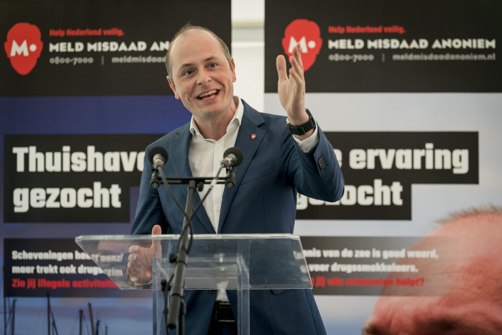 Het derde werkbezoek staat in het teken van ondermijning in de haven. Via Meld Misdaad Anoniem (MMA) hopen we dat bewoners het melden wanneer ze ongeoorloofde activiteiten zien in of rond de haven van Scheveningen. Spreek in een tent aan de Dr. Lelykade de aanwezigen kort toe. Marc Janssen van MMA doet dat ook.
