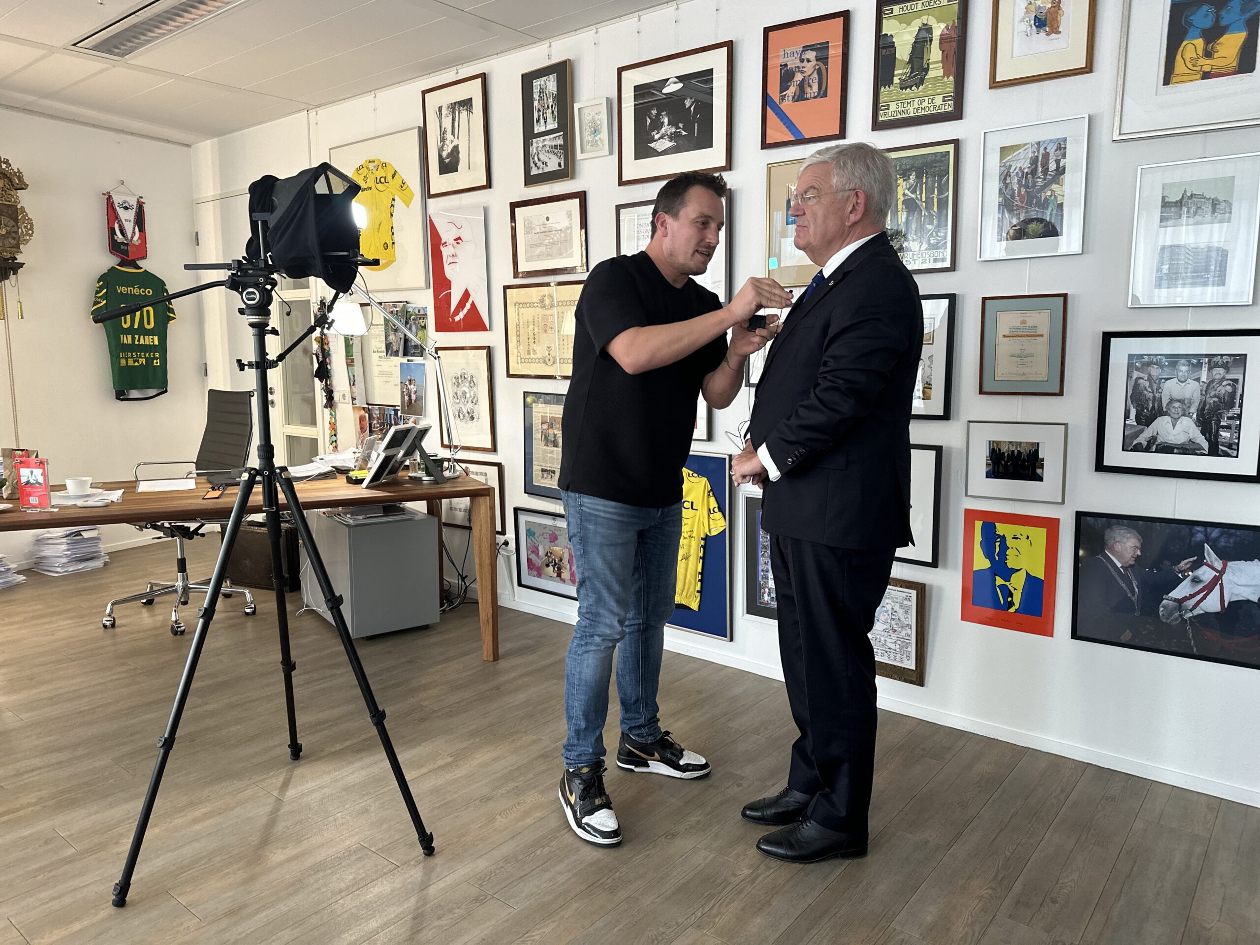 Voor de opname van de documentaire ‘De lange weg naar het monument’ is in de collegekamer een heuse set opgebouwd door cameraman Melle van Essen, assistent Ralph van der Weijer en geluidsman Mark Wessner.