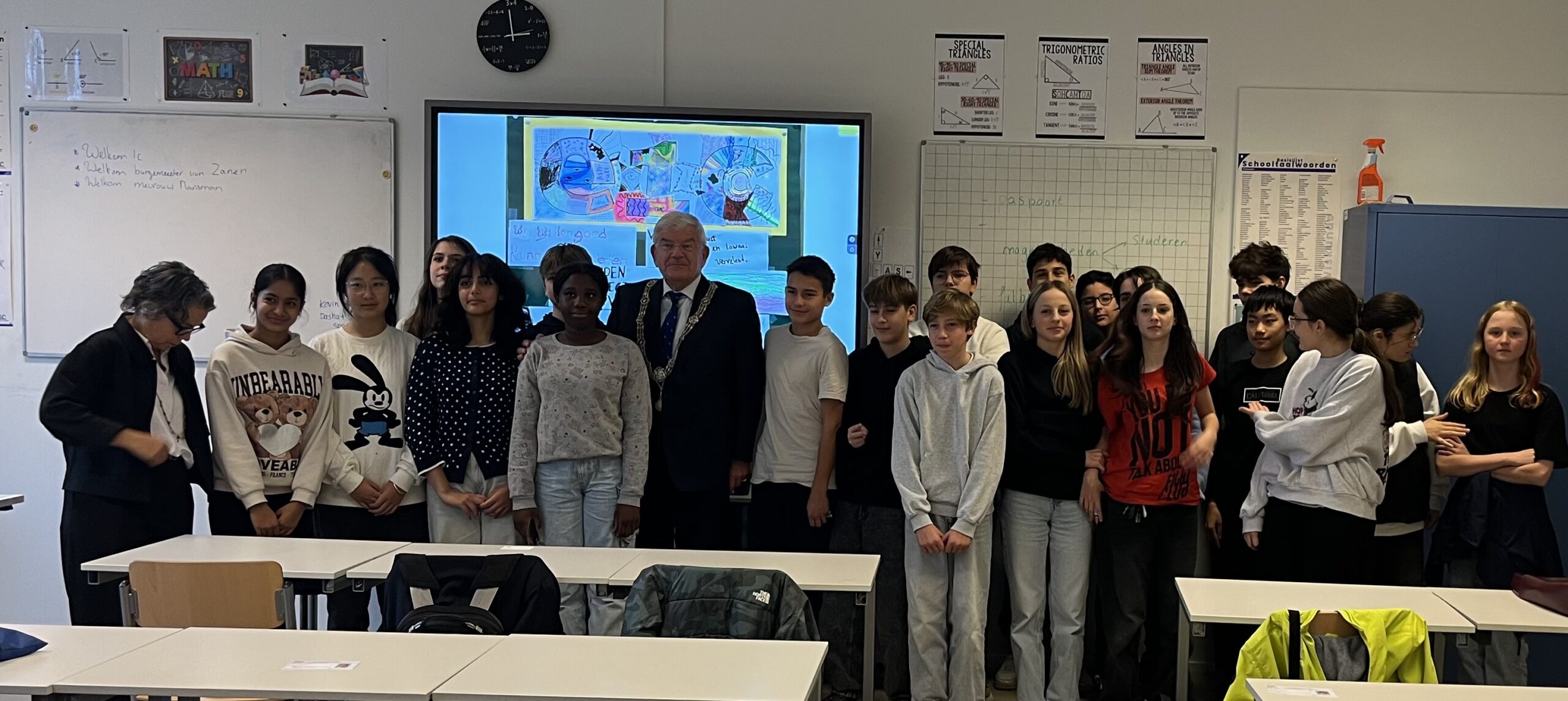 Moet meteen door naar het Edith Stein College aan het Louis Couperusplein. Woonde het eerste jaar van mijn Haagse burgemeesterschap aan dit plein. Het is leuk even in m’n oude woonbuurtje terug te zijn. Geef op uitnodiging van Julia van Leeuwen, Catharina Alting von Geusau en Abby Joffre Eijken van de Respect Foundation een gastles in het kader van de 19e editie van de Week van Respect. Loop in de bekende omgeving via het schoolplein naar het gebouw van het Edith Stein College. Maak kennis met Ilse Daalhof (afdelingsleider vwo) en Bram van der Welle (rector). Ga in gesprek met klas 1C en klassementor Patricia Marsman. De leerlingen komen uit verschillende landen: Amerika, Oekraïne, Roemenië, Argentinië, Polen, China, Sri Lanka, Griekenland, India, Marokko, Turkije en Kosovo. Sommigen zijn hier net, anderen al langer. Spreek met de leerlingen over respect en verbinding. Goed om te doen.