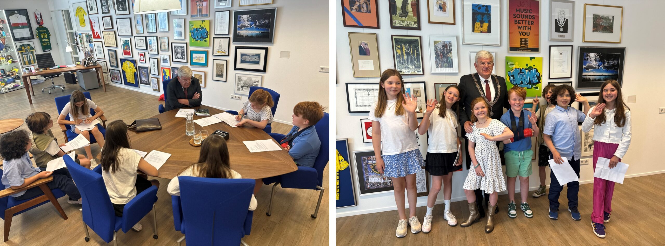 Ontvang, in mijn werkkamer, Josephine, Jack, Maria, Puck, Kate, Miles en Pieter – leerlingen van de Annie M.G. Schmidtschool in de wijk Zorgvliet in het Statenkwartier. Begroet ook hun begeleiders Yvette en Janny. De leerlingen zijn druk bezig met het maken van hun eerste schoolkrant. Ze vragen mij het spreekwoordelijke hemd van het lijf. “Wat wilde u als kind later worden?” Antwoord: “Kok, journalist of stratenmaker.” Toon de ambtsketen en de ooievaar van Den Haag die erop staat. Spreken ook over de NAVO-top die over een maand dicht bij hun school zal plaatsvinden. Vrolijke ontmoeting.