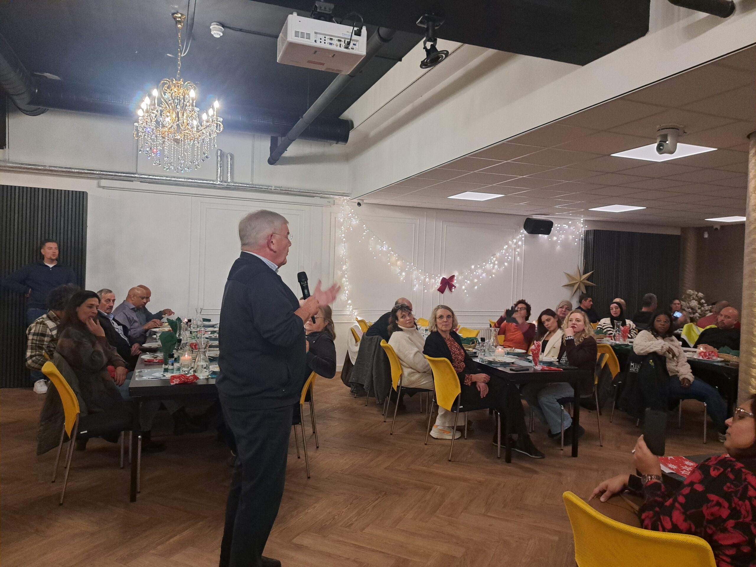 Maak onderweg een korte pitstop bij Nationaal aan de Prinsegracht met kamerbewaarder Tuti en bestuursadviseur Maarten. Doe een beetje energie op, op weg naar het voorlaatste bezoek. En dat is de Participatiekeuken aan de Guntersteinweg. Aldaar organiseert het stadsdeel Escamp samen met Ben Lachhab vanavond het avondeten voor vrijwilligers die zich inzetten voor een veilige jaarwisseling. De veiligheidsregisseurs Floris Buijnink en Lunara Stas zijn erbij, net als de teamchefs van de basisteams Zuiderpark (Ab Khaori) en Beresteinlaan (Gert-Jan van der Burg). Begroet stadsdeeldirecteur Petra Sevinga. Krijg van Ben bijna meteen een microfoon in handen om de aanwezigen kort toe te spreken (“Dan kunnen ze aan hun toetje beginnen”).