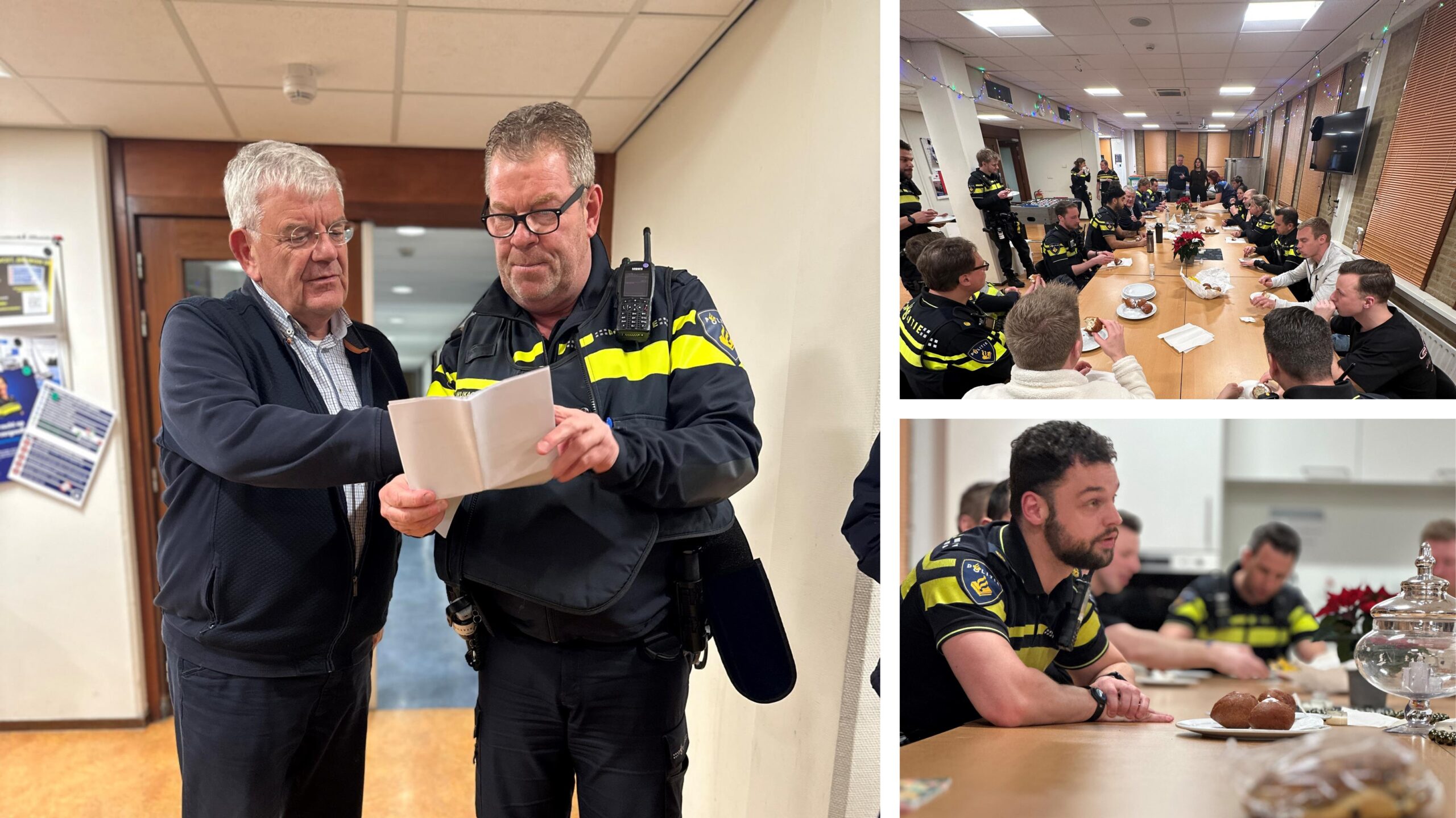Stap voor mijn zevende bezoek in een politiebusje. Twee agenten brengen me naar de Jan Hendrikstraat om daar in het gelijknamige politiebureau in de kantine – onder het genot van een oliebol als traktatie en een kop koffie – de aanwezige medewerkers van de politie en onze handhavingsorganisatie een goede dienst toe te wensen. Dring er ook hier op aan dat ze op hun eigen veiligheid en die van hun collega’s letten. Wens ze veel succes tijdens deze drukke dagen. Dennis Zandbergen, operationeel coördinator (politie), laat me de meldkamer zien en doet me in- en uitgeleide.