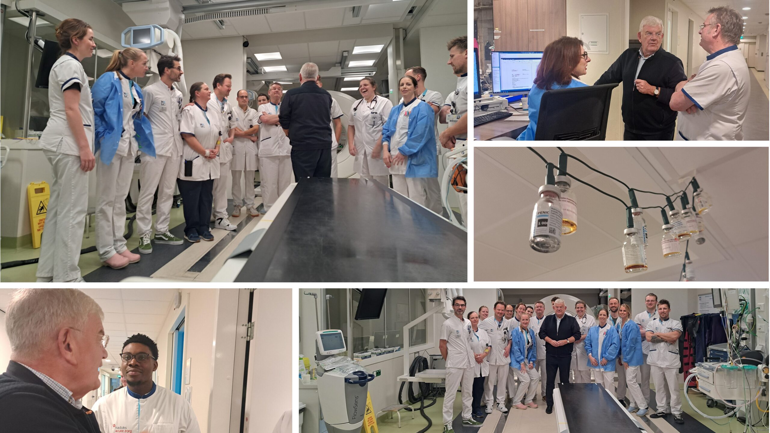 Tref buiten – naar later blijkt niet geheel toevallig – Armando, een van de IT-medewerkers van de gemeente. Door een blessure (zaalvoetbal) loopt hij moeilijk. Behulpzaam als altijd reikt hij mij een nieuw toetsenbord aan voor m’n iPad. Neem afscheid van Armando, Max en Erwin en begeef me naar het HMC Westeinde aan de Lijnbaan. Frans de Voeght (hoofd van de Eerste Hulp) leidt me rond. Steek zijn medewerkers een hart onder de riem. Maak kennis met medewerkers van de eerste hulp en de huisartsenpost. Het team is voorbereid en klaar voor wat komen gaat. Edwin Berg en Milan Hazendonk (beiden van de directie Veiligheid) sluiten aan. Bewonder tijdens mijn rondgang onder andere de ingenieuze kerstverlichting gemaakt van oude medicijnbuisjes. Ga ten slotte in Acuutkamer 1 met iedereen op de foto.