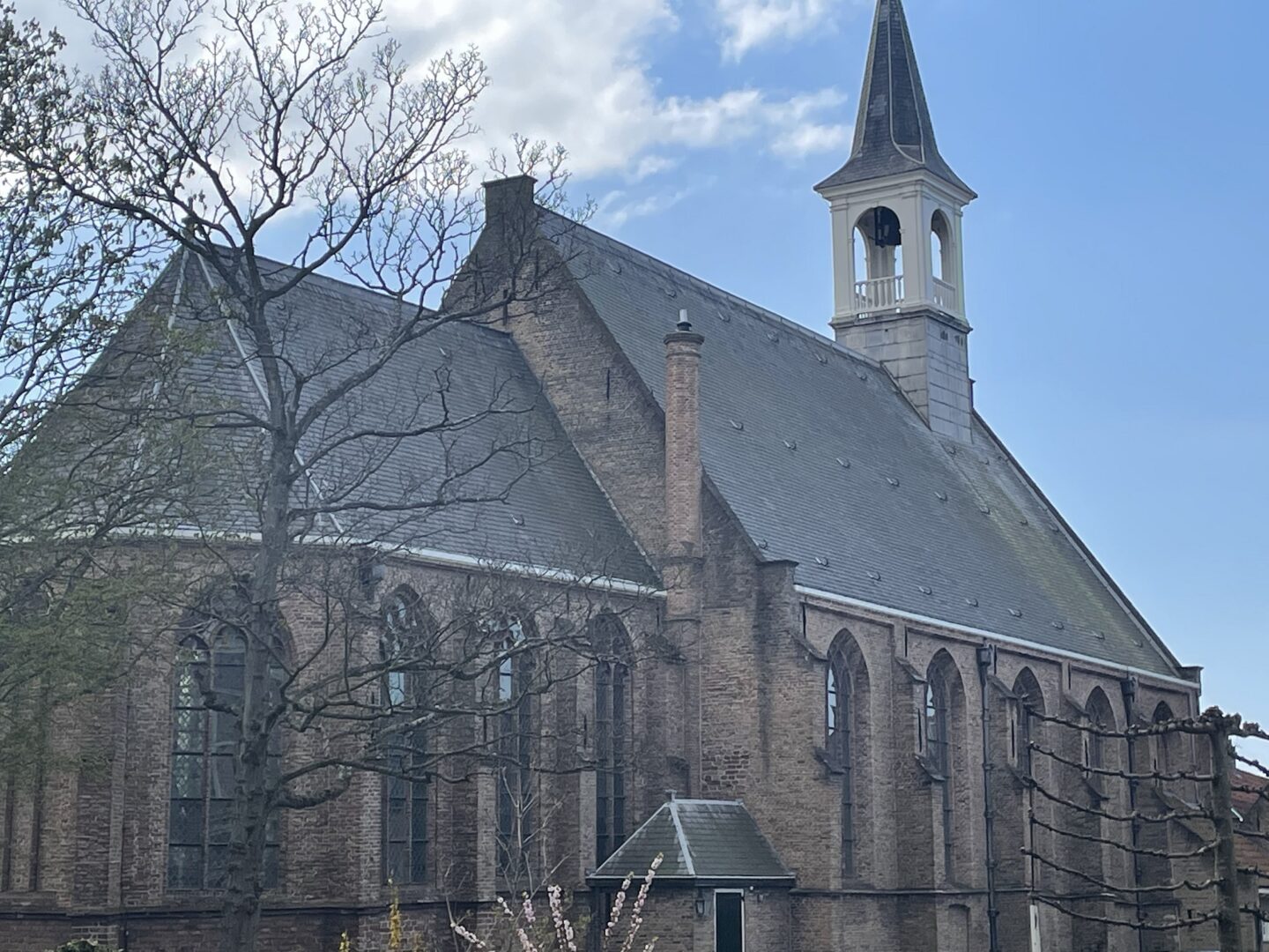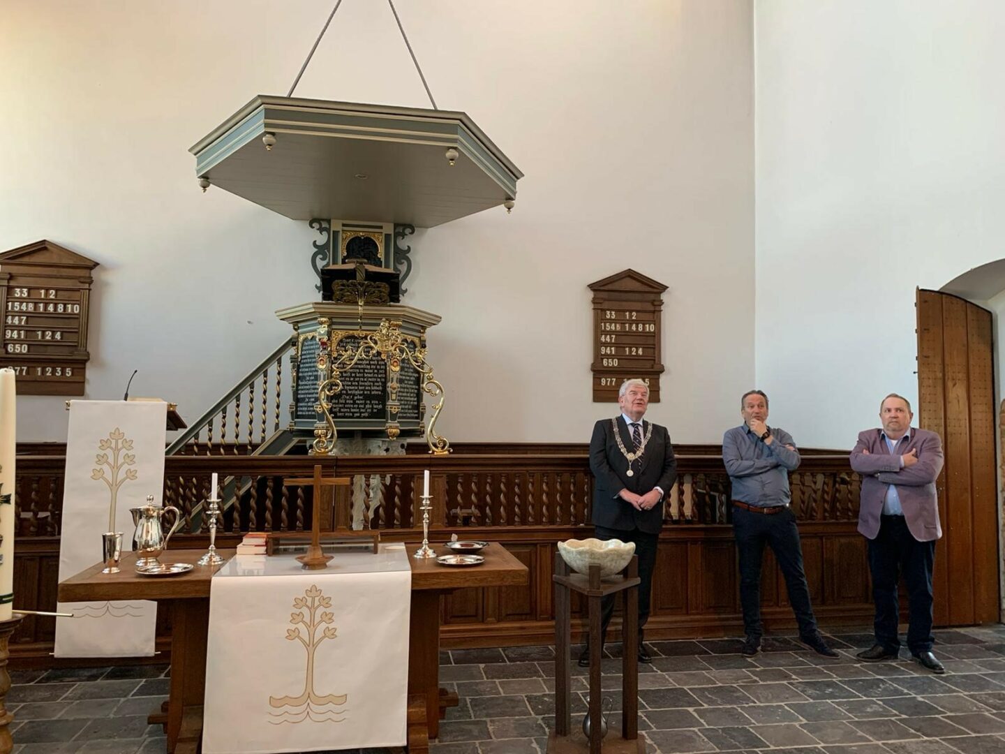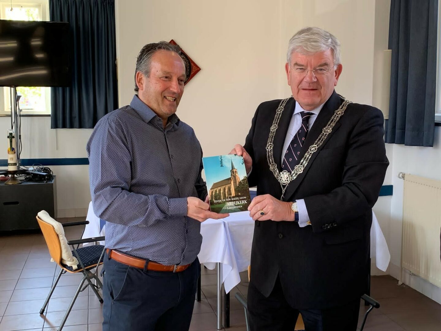 Ga door naar de Loosduinse Abdijkerk. Heb daar afgesproken met auteur Frans van Gaalen, stadsdeeldirecteur Mustapha el Boumeshouli en Leo Hartman, de rentmeester van de Abdijkerk. Buiten begroet de schoonmoeder van Marcel Paul (deze week mijn chauffeur) mij. Leuk om kennis te maken. Rentmeester Leo, dominee Wietske Verkuyl en koster Astrid van Veen leiden me rond door de Abdijkerk – het oudste gebouw van Den Haag. Steek in de kerk een kaarsje op en bewonder de consistoriekamer. Bij een kopje koffie vertelt Frans over de totstandkoming van de Facebookgroep ‘Geboren in Loosduinen’ en over de door hem geschreven boeken. Ontvang het boek ‘Platglas3’ (‘Het is de eerste van de tweede druk’) van Frans. ‘Platglas 3’ is een boek met 62 verhalen en meer dan 150 foto’s over de geschiedenis van het stadsdeel Loosduinen (dit keer oorlogsverhalen van Loosduiners). Krijg op weg naar buiten van Leo Hartman het boekje ‘Zeven en een halve eeuw Abdijkerk’ kado. Leuk en leerzaam bezoek.