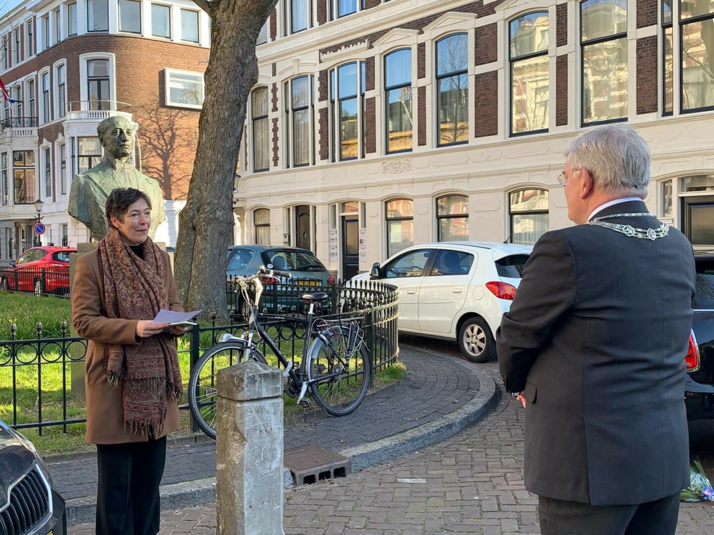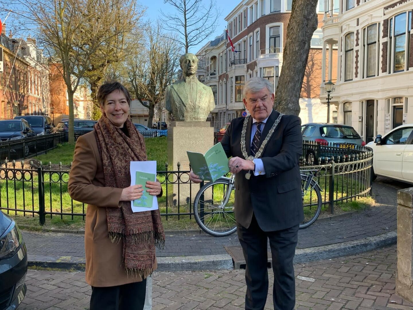Geniet van m’n wandeling in alle vroegte. Begin vandaag in de Surinamestraat bij de buste van Louis Couperus. Neem bij de buste de allernieuwste gedichtenbundel ‘Vlinderboom’ van Lija Hirsch in ontvangst. Vind het een eer. Lija schrijft veel over de (nasleep van de) oorlog en zingt ook Jiddische liederen. Ken Lija en haar gezin uit Amstelveen. Studeerde met haar echtgenoot Frans Hellendall aan de Vrije Universiteit (en zat met Frans in het college van B&W). Wesley (kabinetszaken) vergezelt me. Het is een korte, kleine en sobere plechtigheid in de buitenlucht in aanwezigheid van Lija’s twee beste vriendinnen en haar zonen. Citeer in mijn dankwoord het prachtige gedicht ‘Kiem’ (te vinden op bladzijde 32 van de bundel).