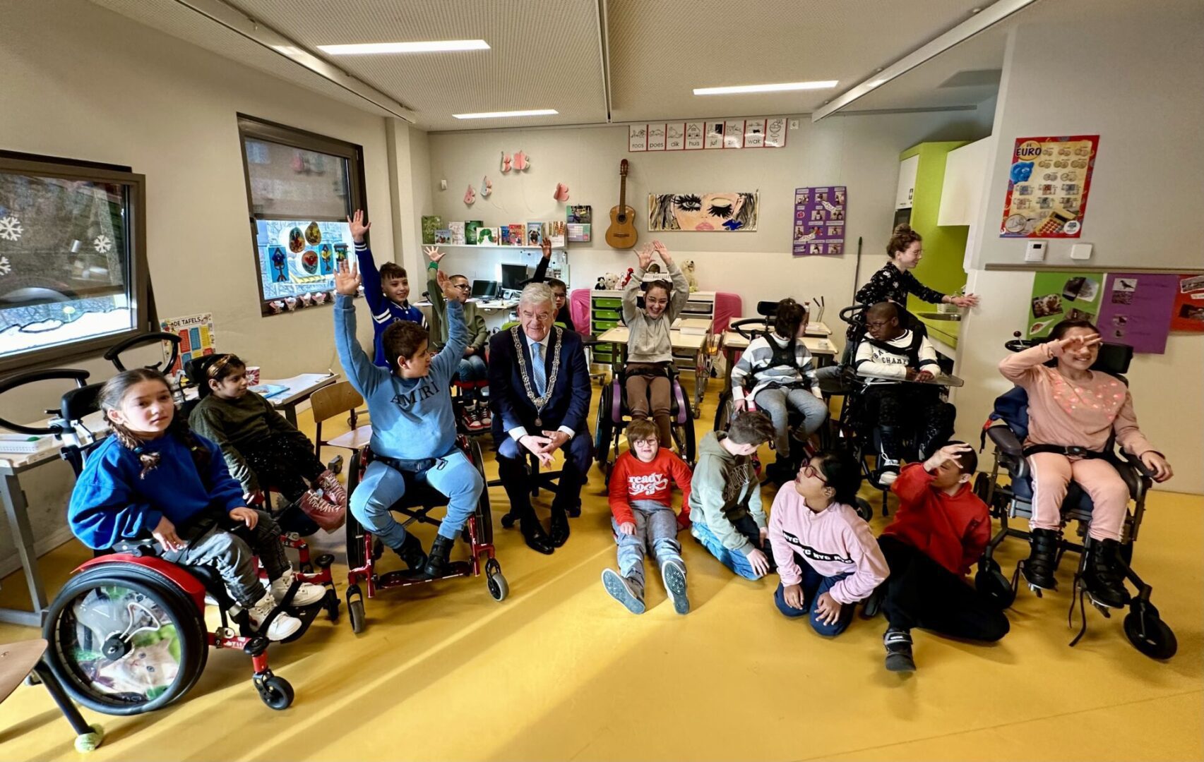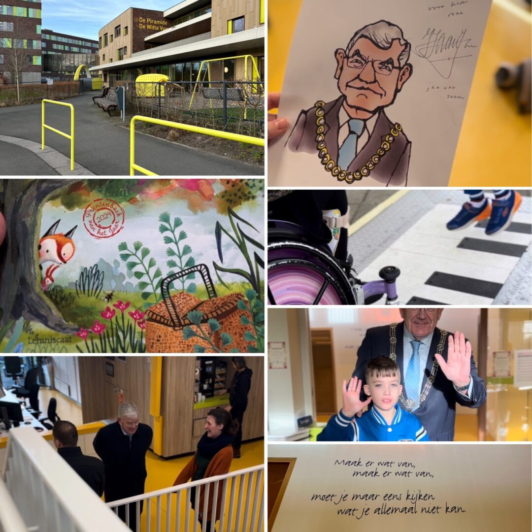 Rijd heen en weer naar Max Health Club voor m’n dagelijkse zwembeurt. Begin vanochtend voor het werk met een bezoek aan het Tyltylcentrum De Witte Vogel aan de Melis Stokelaan. Doe dit op uitnodiging van Raymond Been, managementassistent op deze school. Ontmoette Raymond eerder toen hij werkzaam was voor Kindcentrum Bamboe. In het pand worden drie soorten onderwijs aangeboden: het tyltylcentrum voor kinderen met een meervoudige beperking, het mytylcentrum (de piramide) voor kinderen met een lichamelijke beperking en het KDC (kinderdagcentrum) voor jonge kinderen tot vijf jaar met een meervoudige beperking. Word allerhartelijkst ontvangen door directeur Ryanne, Raymond en de leerlingen Levi en Djamila. Ze laten mij vol trots hun schoolplein zien, dat recent is voorzien van nieuwe speeltoestellen. Nu is het er rustig, maar laat mij vertellen dat hier ’s ochtends zo’n 40 regiobusjes aan en af rijden om de leerlingen naar school te brengen. Het schoolplein en de speeltoestellen zijn speciaal ontwikkeld voor de kinderen van deze school, waarmee zij worden ondersteund in de ontwikkeling van hun zintuigen. Er zijn veel muzikale toestellen aanwezig, maar ook een heus looppad waar je over verschillende soorten ondergrond kunt lopen. Na de ronde buiten gaan we naar binnen, waar Ryanne en Raymond onder het genot van een kop koffie en chocomel meer vertellen over het centrum. Ze werken nauw samen met het naastgelegen revalidatiecentrum Basalt. De medewerkers van Basalt geven therapie aan de leerlingen van het centrum en de leerlingen kunnen in het naastgelegen gebouw gebruikmaken van het zwembad. Maak en passant kennis met de vrolijke muziekdocente Willemien Breeschoten. Loop met het gezelschap naar het klaslokaal van de groepen Paars en Roze. Lees, in het kader van De Nationale Voorleesdagen 2024, voor uit het prentenboek van het jaar van Miriam Bos Help! Een verrassing!.