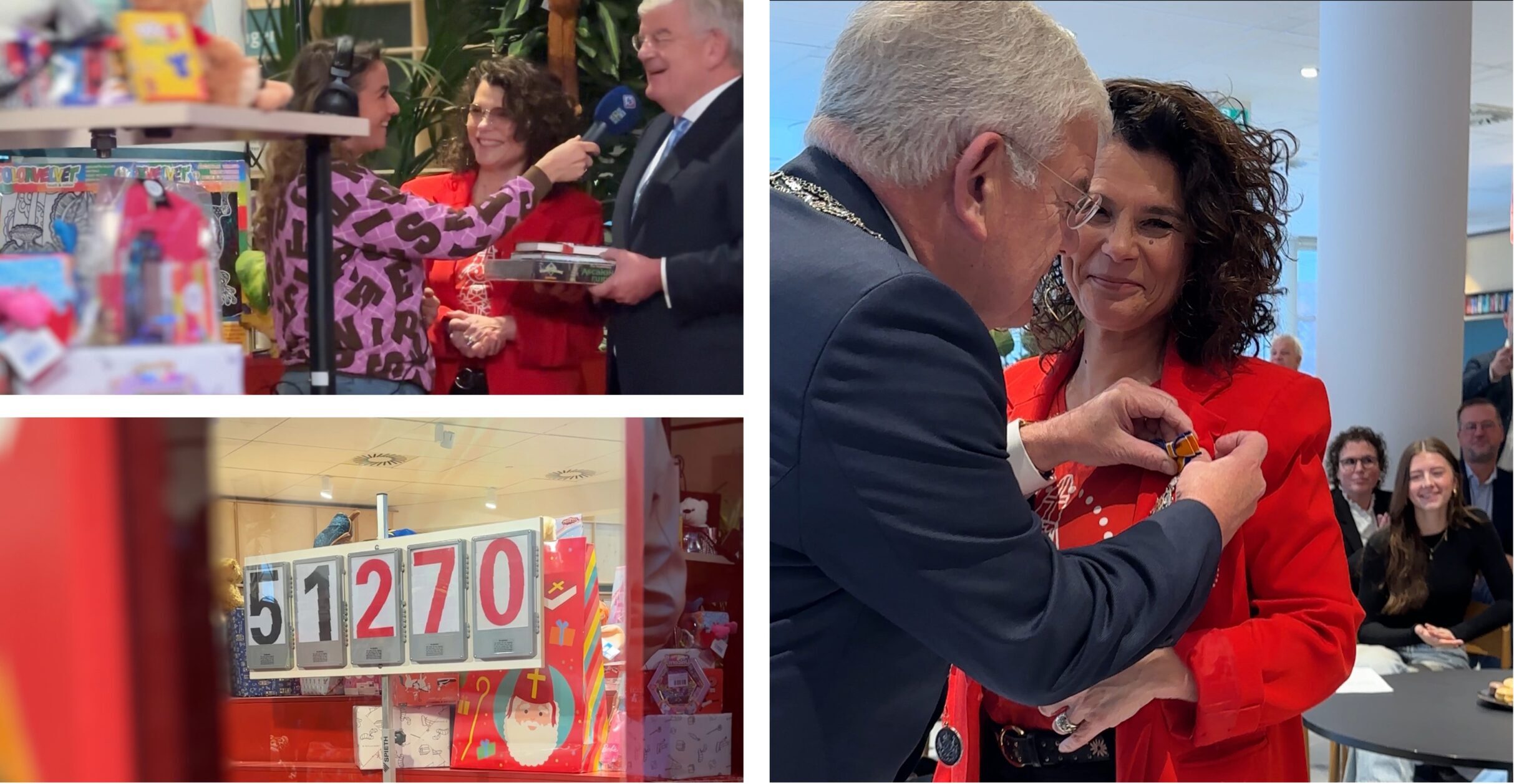 Breng ook dit jaar een bezoek aan de inzamelactie Sintvoorieder1. Loop daartoe naar de Centrale Bibliotheek. De stichting Sintvoorieder1 zamelt cadeautjes in voor kinderen die anders geen sinterklaascadeautjes krijgen. Esther Blom, initiatiefnemer en operationeel directeur van de stichting, vangt me op. Bied in de gezamenlijke radio-uitzending van Omroep West en Den Haag FM haar en presentator Jessica Mendels mijn cadeautjes aan (“Voor oudere jongeren, zal ik maar zeggen”). Het is deze week 15 jaar geleden dat dit initiatief is ontstaan aan Esthers keukentafel. In Studio B zijn inmiddels haar familie, vrienden en vrijwilligers samengekomen. Ze zijn er niet alleen voor de viering van het 15-jarig bestaan. Floor Bogman leidt een totaal verraste Esther naar een verdieping hoger. Het wordt ‘nog leuker’. Reik namens Zijne Majesteit de Koning de versierselen uit die horen bij een Koninklijke onderscheiding. Zeer verdiend.