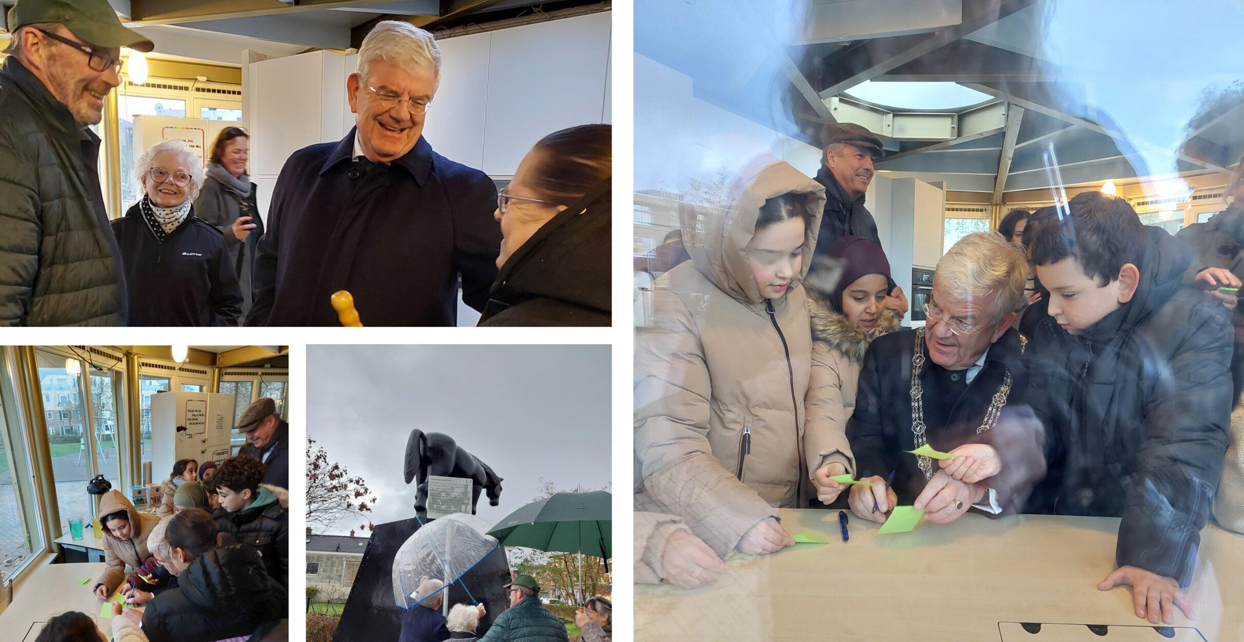 Draag ’s middags in de stromende regen in het Hannemanplantsoen in de Schilderswijk op uitnodiging van Gabriëlle Kaatee bij aan de onthulling van een informatiebord. Begroet de stadsdeelmedewerkers Isolde en Isabelle en de buurtbewoners Wilma en Greet. Door de inzet van de moeder van Wilma, mevrouw Van der Linden, en mevrouw Van der Gruut (allebei helaas overleden), is er eind jaren 80 een standbeeld van een paard geplaatst. Dit ter herinnering aan het paard van de schillenboer. Axel (en Helena van der Kraan) hebben het standbeeld destijds gemaakt. Eervol dat Axel er vandaag – vanuit Rotterdam – ook bij is. Het paard van de schillenboer is een symbool voor alle paarden in de Schilderswijk. Paarden maakten deel uit van het samenleven hier. Vertel over deze geschiedenis en onthul, samen met Wilma, Greet en Axel, het informatiebord bij het standbeeld.