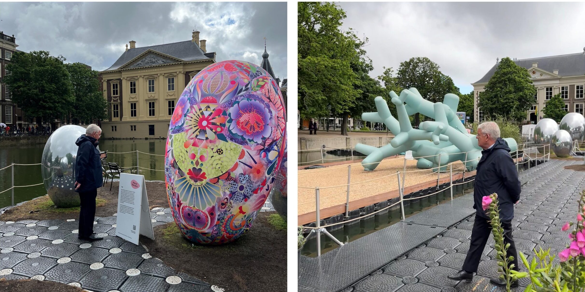 Fietsen via het Lange Voorhout richting het Stadhuis. Begroeten de aanwezige stadsambassadeurs op het hoekje bij de Lange Vijverberg en brengen een bezoek aan de BlowUp Art Den Haag. Dit jaar ligt de focus op het hart van de stad: de Hofvijver. Op een drijvend ponton zijn werken van Marcel Wanders, Job Smeets, Studio Mieke Meijer en Sigrid Calon te bewonderen. Betreed het ponton. De medewerkers Jaap, Lisa en James zijn bezig met het gereedmaken van de tentoonstelling (enkele stukken behoeven nog wat lucht).