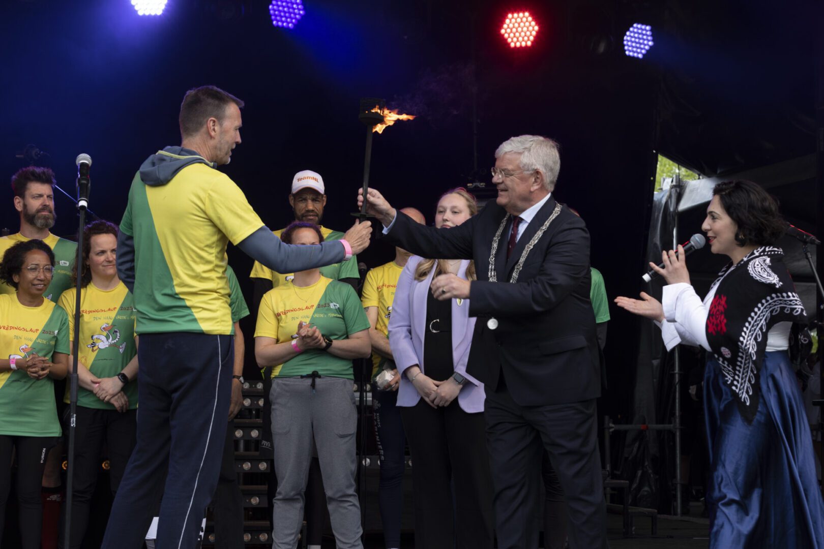 Draag rond half vier met een korte toespraak bij aan de officiële opening van het Bevrijdingsfestival op het grote podium alwaar Asefeh Eskandari het programma presenteert. Neem het vuur van de vrijheid in ontvangst van de estafettelopers die afgelopen nacht met de fakkel van Wageningen naar Den Haag zijn gelopen. Geef het vuur door aan Jessa Zweverink die de grote Vrijheidsvlam boven het podium aansteekt. Jessa was dit jaar een van de ontvangers van een Haags Jeugdlintje.