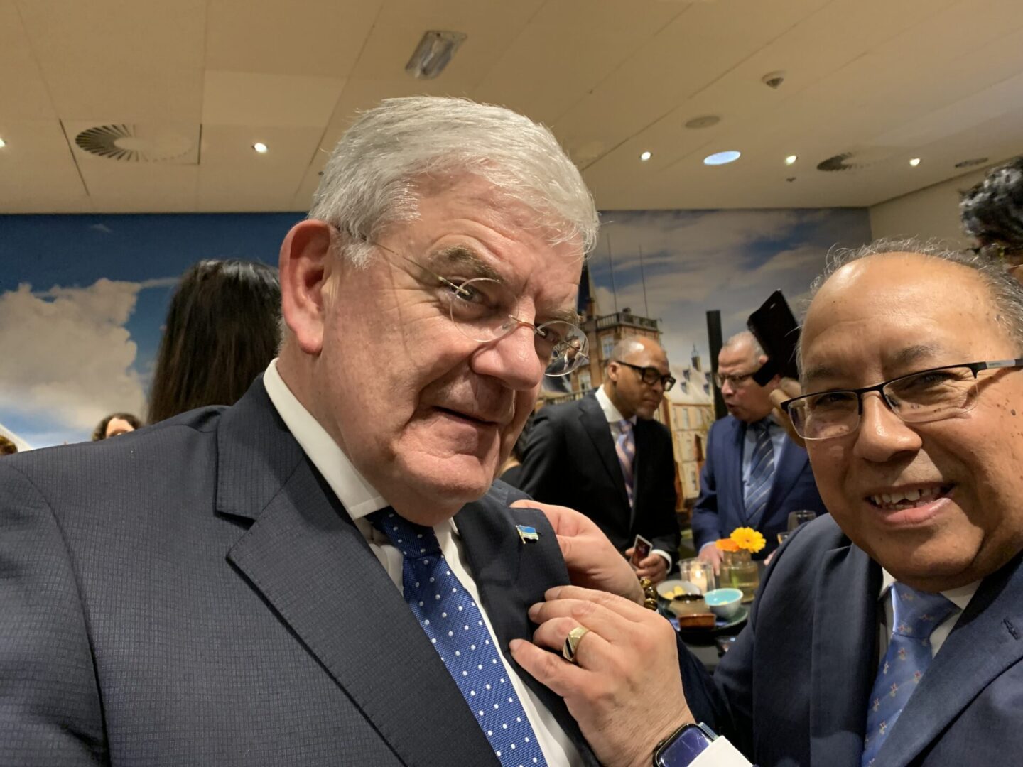 Kan ’s avonds nog wel even naar een ontvangst ter gelegenheid van de Nationale dag van Aruba: Dia di Himno y Bandera (Dag van het Volkslied en de Vlag). Groet staatssecretaris Alexandra van Huffelen en ambtgenoot Leontien Kompier (Venraij). Maak onder anderen kennis met Alwin Toppenberg en met de plv. gevolmachtigd minister van Sint Maarten, Richard Panneflek. Gevolmachtigde minister Ady Thijsen is een vriendelijke gastheer. Hij speldt mij persoonlijk zijn Arubaanse speldje op. En natuurlijk is er swingende muziek in het Babylonhotel aan de Bezuidenhoutseweg. Masha Danki.
