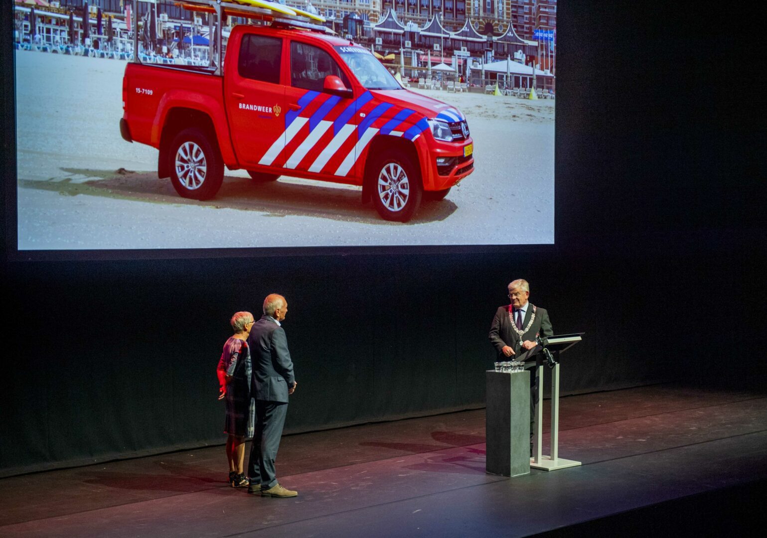 Meteen door richting het Zuiderstrandtheater aan de Houtrustweg. Reik aldaar aan de voormalige commandant van de brandweer, Jan Bron, namens Zijne Majesteit de Koning de versierselen uit die horen bij een Koninklijke onderscheiding. Sandra van der Zwan (kabinetszaken) vergezelt me. Zwaai naar mijn voormalige ambtgenoten Ineke van der Wel en Bas Verkerk.
