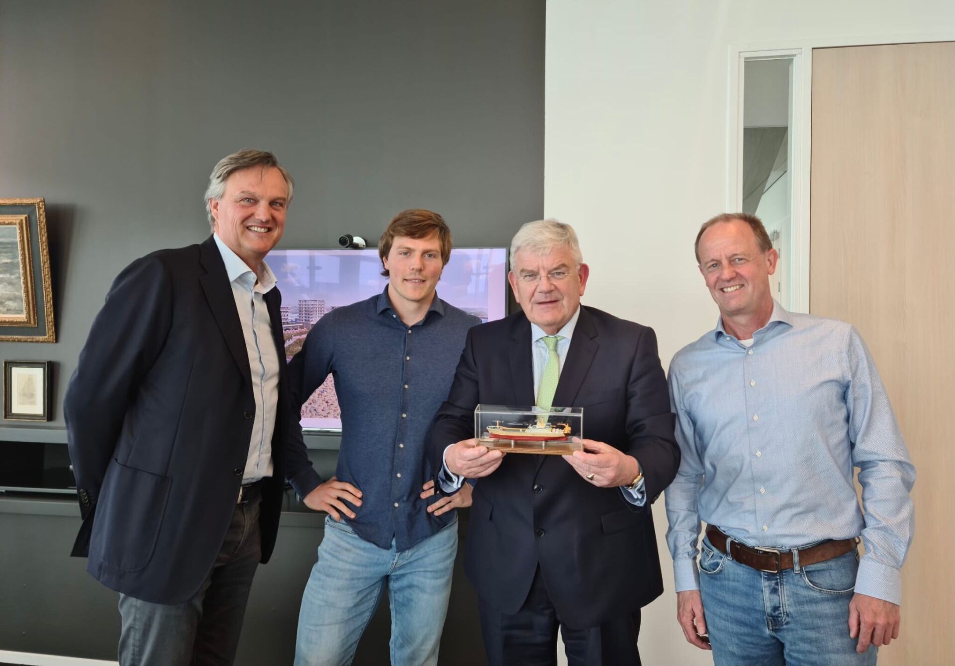 Ga meteen door naar de Hellingweg. Ga op bedrijfsbezoek bij rederij Van der Zwan. Eigenaar Willem van der Zwan, CFO Gerard Zwijnenburg (CFO) en zijn zoon Lars leiden me rond en informeren me over het bedrijf. De medewerkers Wim, Casper en Hielke (allen van Economische Zaken) vergezellen me. Spreken over het ontstaan van Van der Zwan. Over pelagische vis (vis van open zee). Over het voeden van miljoenen mensen in Afrika met duurzaam gevangen vis. En over wat nu en straks nodig is om Scheveningen gezamenlijk te ontwikkelen tot een aantrekkelijke plek om te leren, te werken en te innoveren. Krijg na afloop een miniatuur van de ‘Scheveningen 6’ kado. Ben vereerd.