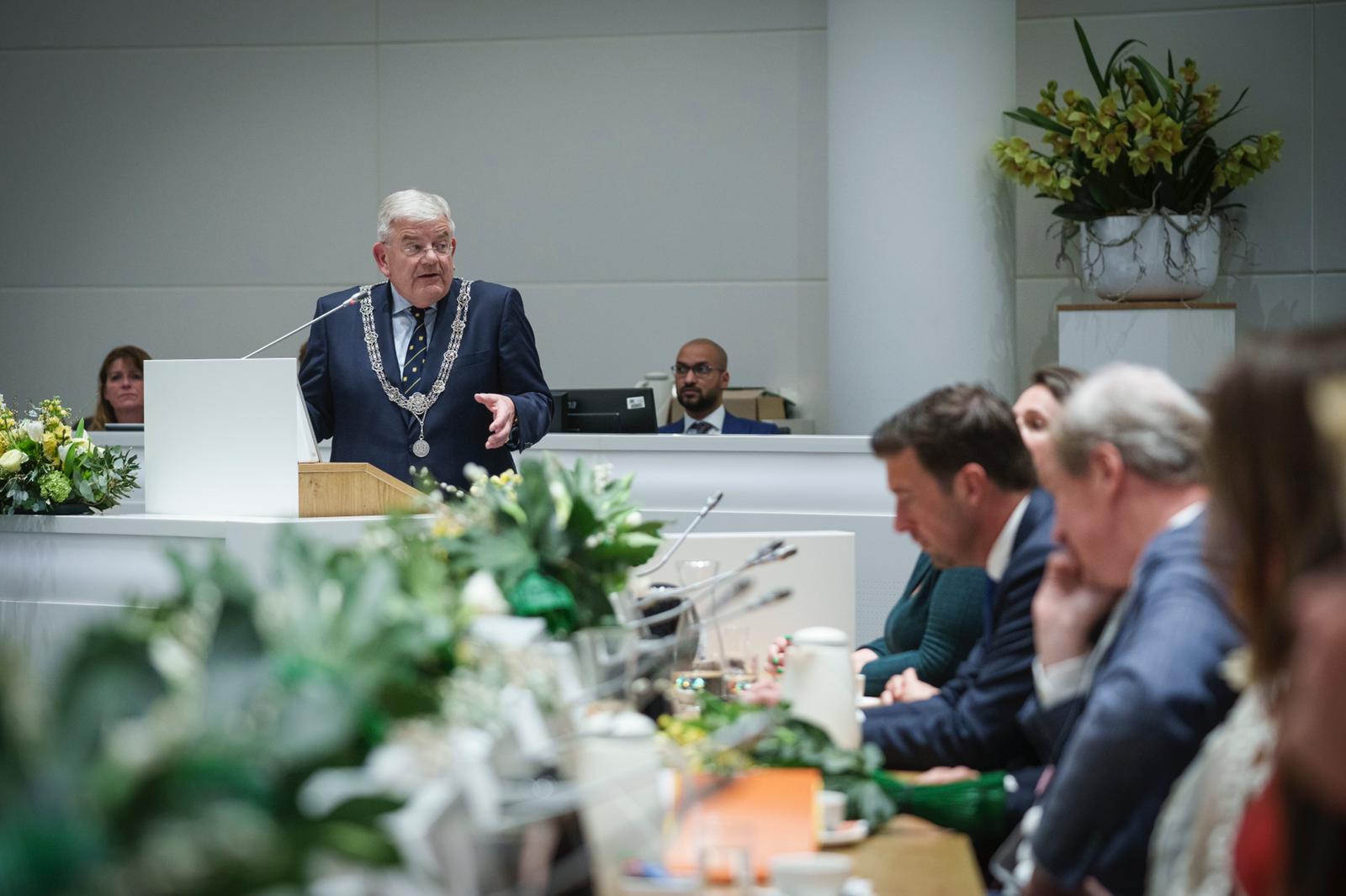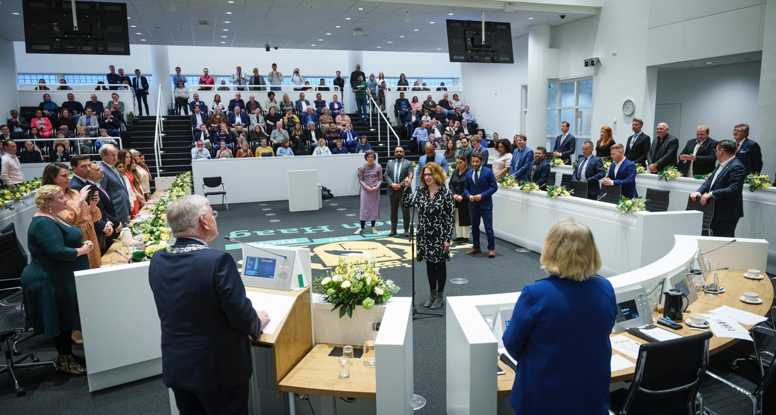 Ben aan het begin van de avond terug op het Stadhuis. Zit de zogenaamde installatieraad voor. Beëdig de nieuwe ploeg van 45 zittende en kersverse gemeenteraadsleden. Zij hebben de komende vier jaar de mooie maar ook verantwoordelijke taak de inwoners van onze stad te vertegenwoordigen. Spreek hen toe en wens ze veel succes bij het dienen van het lokale publieke belang in onze fraaie stad Den Haag. Ze komen in zes groepjes in de ring van de raadzaal aan me voorbij en leggen de eed of de belofte en verklaring af. Doe even later de beëdiging van de 19 fractievertegenwoordigers. Maak na afloop tijdens een informele nazit met zoveel mogelijk van de nieuwe raadsleden kennis. Begroet ook de Haagse fotograaf Erwin van der Lem.