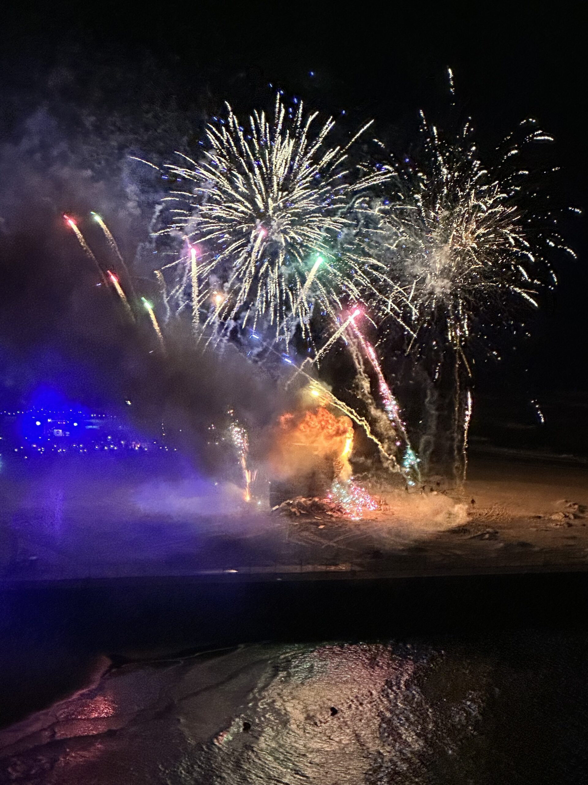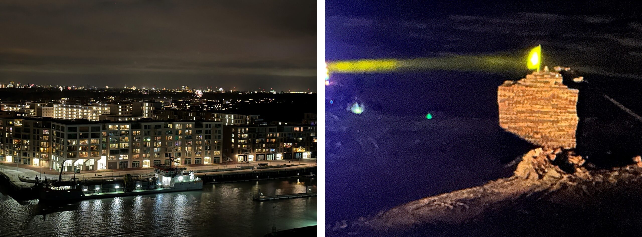 Het leek de directie veiligheid en de politie wegens de enorme drukte en toeloop veilig noch verstandig om zoals ik de voorgaande twee jaar heb gedaan beide vreugdevuren ’s avonds buiten vanaf het Noordelijk havenhoofd te bekijken. Als alternatief is gekozen voor de hoogste verdieping van Inntel. Aldus gebeurt. Directeur Stephan Koelemans doet me in- en uitgeleide. Kan op deze plek beide vreugdevuren aanschouwen. Ziet er fraai uit. Directeur Veiligheid Herke Elbers en twee politieagenten vergezellen Simone en mij.