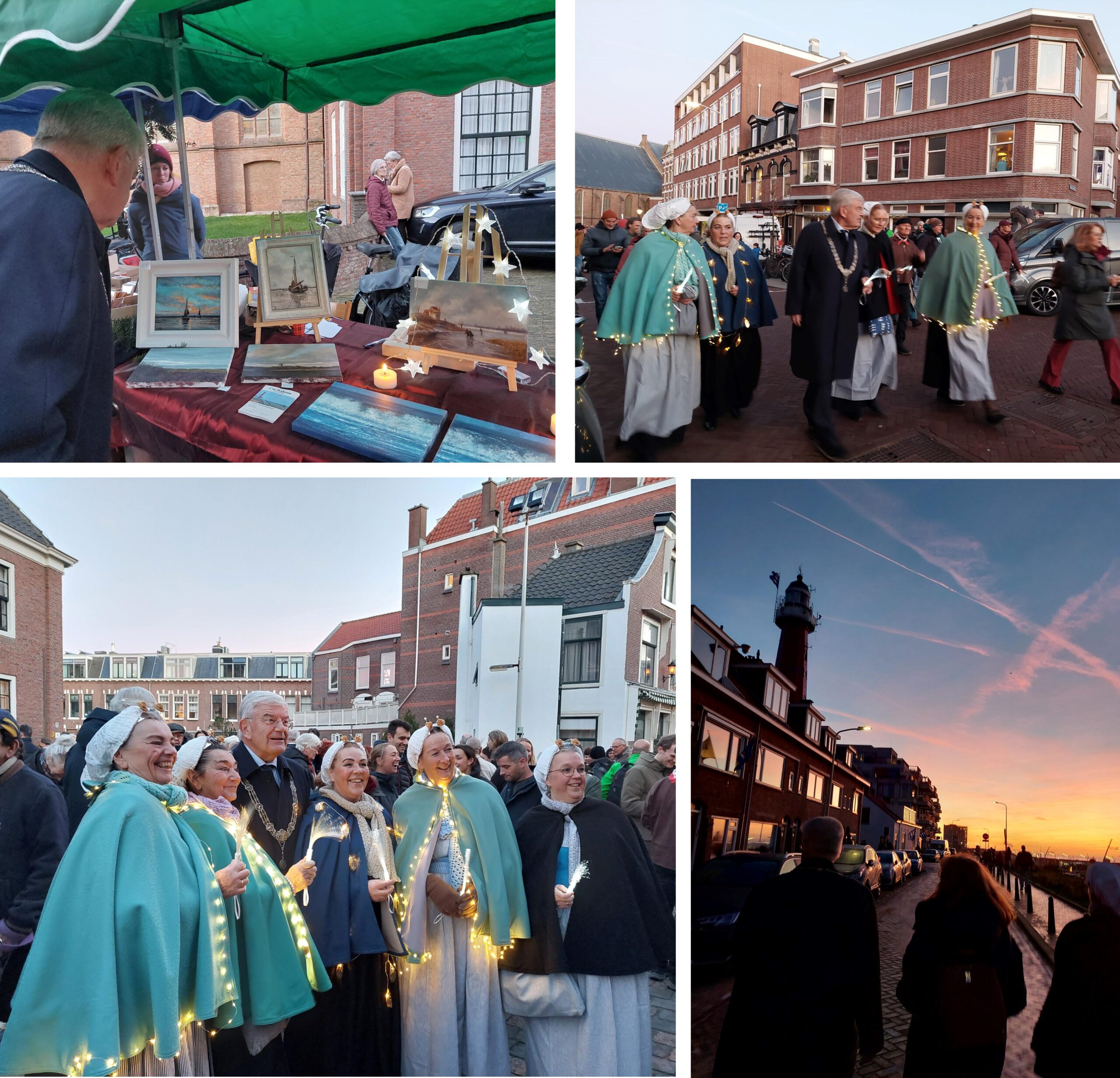 Ga aan het begin de avond naar de Oude Kerk aan het begin van de Keizerstraat. Het is gezellig druk wegens de kerstmarkt (Kerst in de Straet) met allerlei lokale makers. Ben hier echter voor een andere gelegenheid: 150 jaar Scheveningse Vuurtoren. Sinds december 1875 staat de vuurtoren fier op Scheveningen. Groet bij aankomst Jolanda Maas (voorzitter), Cokkie de Vos (secretaris), Bert van der Ham (bestuurslid) van de bewonersorganisatie Scheveningen-Dorp/WOS en Bewonersorganisatie Havenkwartier-voorzitter Coen de Jong. Loop, vergezeld door Scheveningse vrouwen in dracht, vanaf de Oude Kerk in een lichtjeswandeling naar de vuurtoren. De hemel kleurt prachtig.