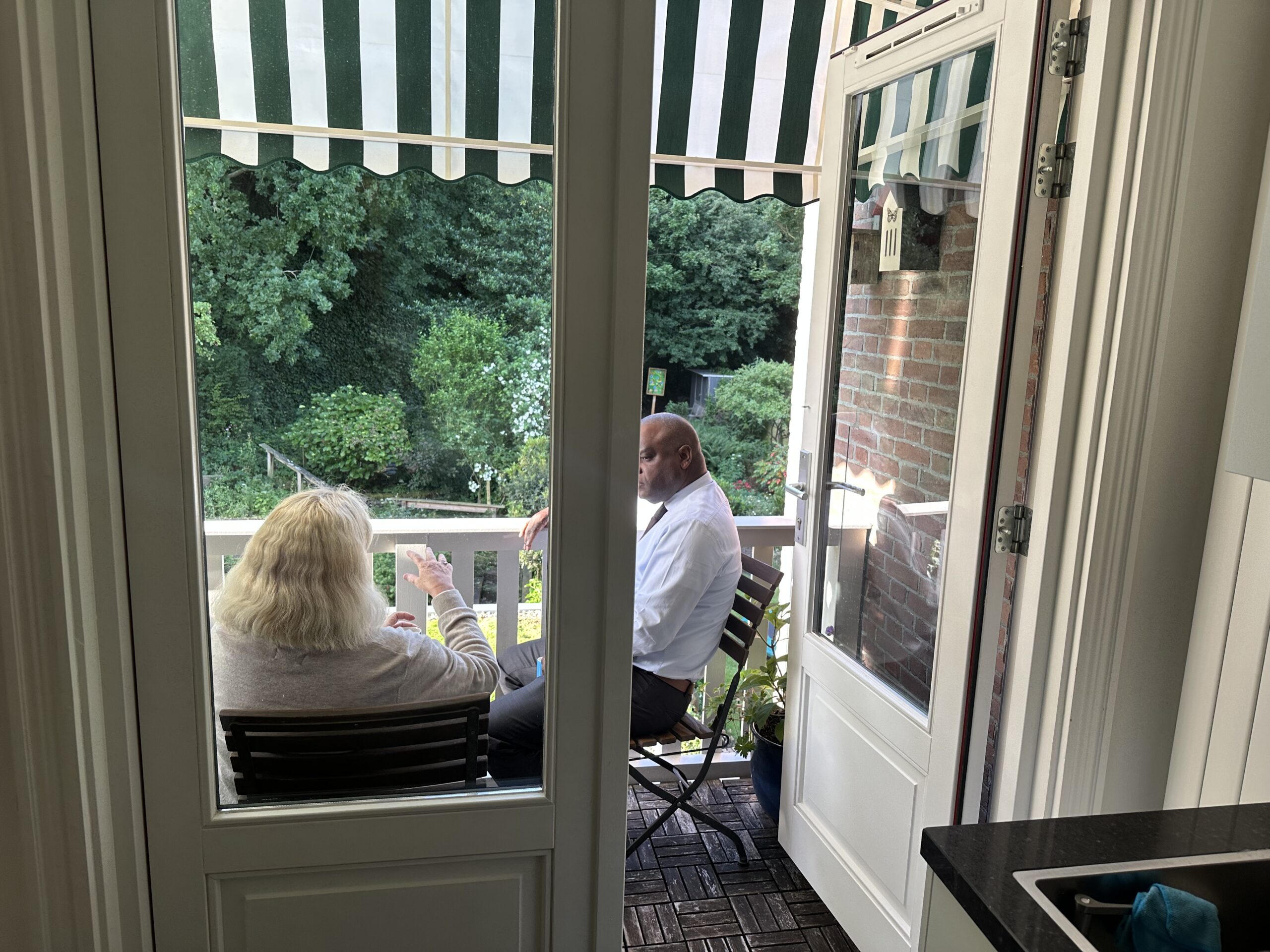 M’n dochter stuurt zondagochtend in alle vroegte vanuit Frankrijk een hartelijke vaderdaggroet met foto. Attent. Kamerbewaarder Tuti en woordvoerder Annelou drinken om half acht een kopje koffie op het balkon bij mijn keuken.