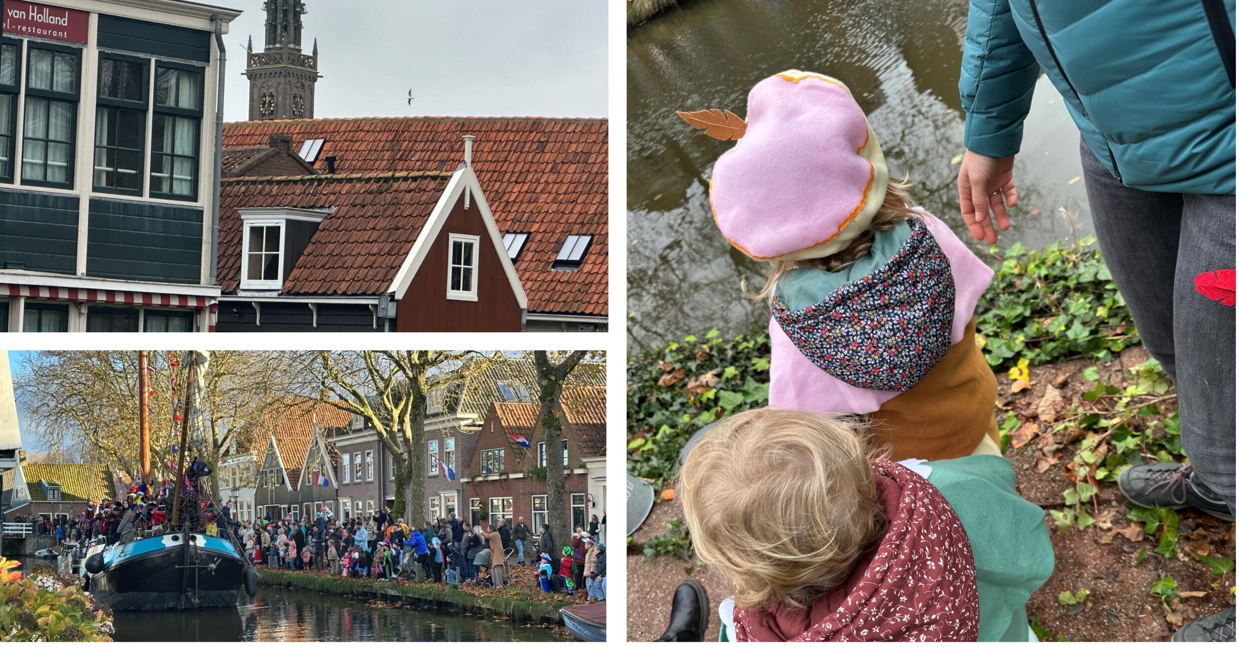 Daar bekijk ik buiten in de achtertuin – in het gras staan paddenstoelen – samen met mijn kinderen en kleinkinderen Florien (3) en Jolein (2) en huidige en vroegere buren en kennissen van m’n ouders (opnieuw) een aankomst per pakjesboot van Sint Nicolaas. Dit keer in Edam. Hier is de Sint vergezeld door zijn (kano en disco) pieten, de Kaaskapel en de Vechtbloazers. De Sint verlaat de boot aan de Schepenmakersdijk. Even later rijdt de Goedheiligman in een open koets door de Lingerzijde – Florien krijgt een handje van de Goedheiligman en pieten gooien pepernoten door de voordeur naar binnen – en de Kleine Kerkstraat richting het Stadhuis op het Damplein waar burgemeester Rick Beukers Sinterklaas verwelkomt. Voor mijn broer Koos, m’n kinderen en mijzelf sweet memories.