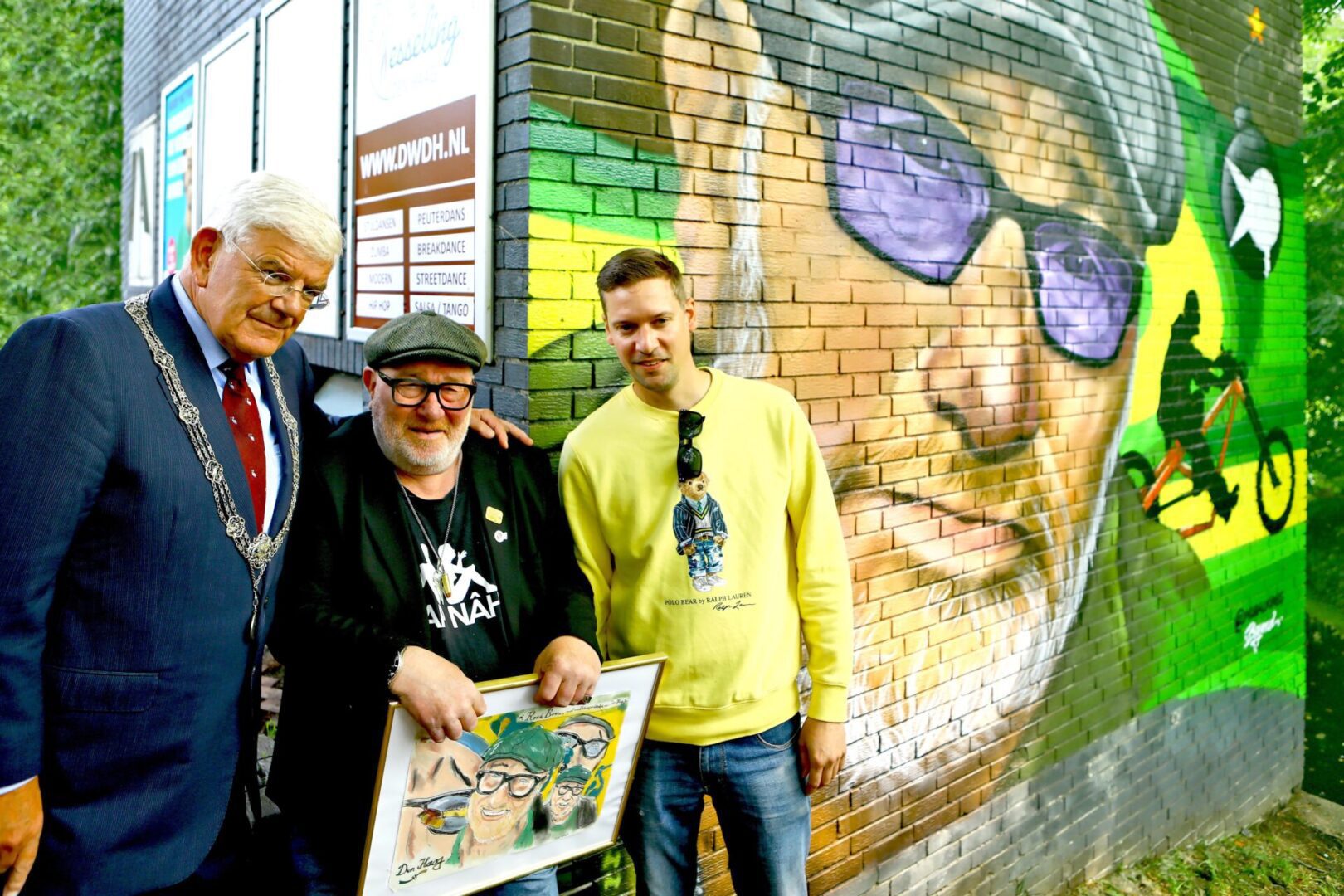 Ontmoet de dochters van René: Kelly en Zoey. Ook de oudere zus van René uit Groningen is er. De familie Bom woonde vroeger aan de overkant in de Vreeswijkstraat. Vandaar deze locatie. Spreek na het welkomstwoord van Henk Augustijn de aanwezigen toe. Vervolgens onthullen René, Roelof en ik de schildering op het elektriciteitshuisje.
