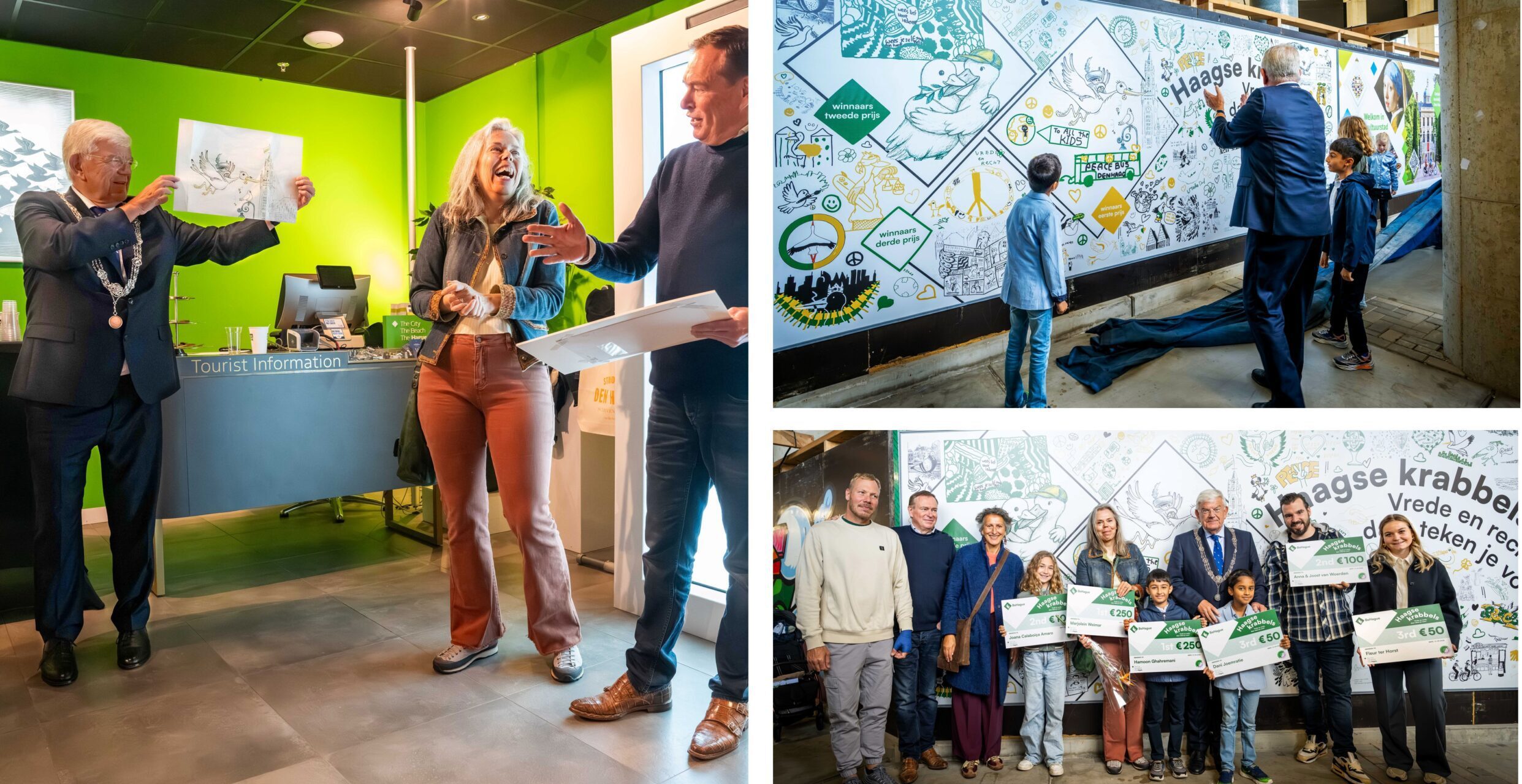 Op naar de volgende afspraak. Bezoek op deze internationale Dag van de Vrede Station Den Haag Centraal. Loop met Freek naar The Hague Info Store. Als onderdeel van de Road to Summit-programmering in aanloop naar de NAVO-top organiseerde Bureau Citybranding van de gemeente Den Haag onder andere de tekenwedstrijd Haagse Krabbels. Voor deze tekenwedstrijd zijn ruim 600 (!) tekeningen ingezonden. Hagenaars en Hagenezen konden op allerlei manieren deelnemen aan Haagse Krabbels. Ze konden hun vrede en recht-tekening online maken, op papier tijdens workshops of ze konden de inzending per post insturen. Nynke Wiersma (Bureau Citybranding) doet me in- en uitgeleide. Begroet in de Info Store de juryleden Pat Smith, Bruno Bruins en Meher Khan Muztar. Zij maakten de selectie en reiken de prijzen uit aan de winnaars. Stuk voor stuk prachtige tekeningen. De winnende tekeningen zijn in een collage verwerkt. Maak kennis met de winnaars. Draag met een korte toespraak bij aan de bijeenkomst. Wandelen vervolgens met z’n allen naar de tunnel richting de fietsenstalling. Onthul daar samen met de (jeugdige) winnaars de collage. Ga na afloop met de prijswinnaars Hamoon, Joana, Dani, Marjolein, Anna & Joost en Fleur op de foto en zeg gedag.