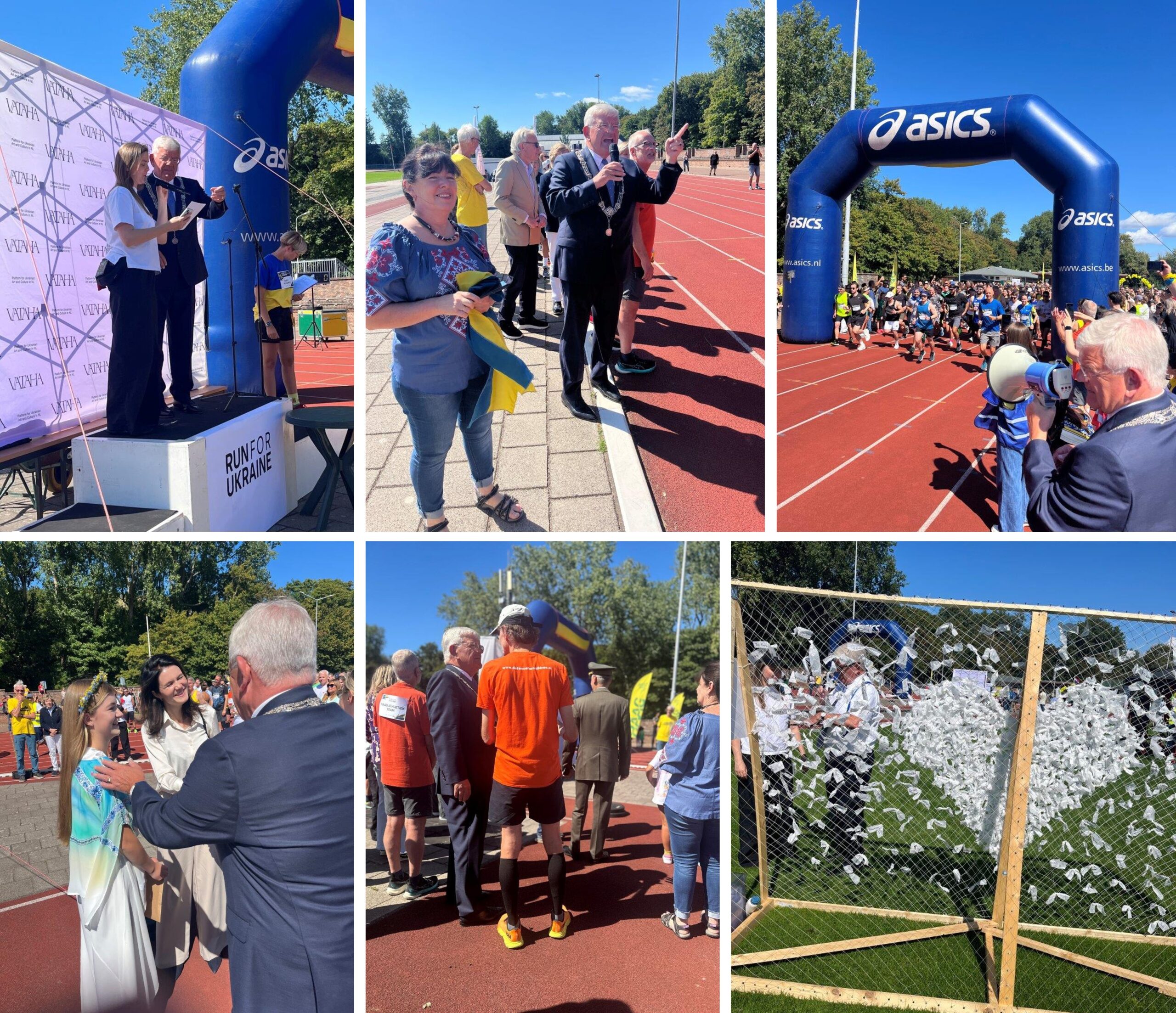 Ben tegen twee uur samen met Carola (kabinetszaken) bij Haag Atletiek aan de Laan van Poot. Woon er de start bij van de derde editie van de Run For Ukraine. Het is de 34e onafhankelijkheidsdag van Oekraïne. Daarom is namens de ambassade van Oekraïne ook defensieattaché kolonel Yurii Herashchenko aanwezig en zingt goede bekende Veronika Morska het volkslied van Oekraïne. Actief atlete en gemeenteraadslid Caroline Verduin (in blijde verwachting), Luuk Leussink, Peter van Raalte en de organiserende dames Uliana en Bun verwelkomen mij allerhartelijkst. Begroet Haag Atletiek-voorzitter Pierre Heijnen en Jaap en Jeannine de Hoop Scheffer. Vele honderden lopers, sporters en supporters zijn samengekomen. Het is mooi dat zo velen onverminderd achter Oekraïne staan. Door te lopen in de sponsorloop, door geld in te zamelen en door morele support te bieden helpen we de bevolking daar. Oksana Savchuk (VATAHA) vertaalt mijn korte toespraak in de moedertaal van de vele Oekraïners die aanwezig zijn. Verricht het startschot voor de loop van de allerjongsten (400 meter) en daarna voor de 10 kilometer. Eervol allemaal. Na afloop leidt Oksana (“Ik ben architect van beroep”) mij rond langs een aantal kunstwerken. De werken geven uiting aan pijn en hoop. Krijg tijdens de rondleiding uit handen van Ihor Sukhorukov het boek ‘Ornament compositions’ van Vasyl Krychevskyi overhandigd. Indrukwekkend.