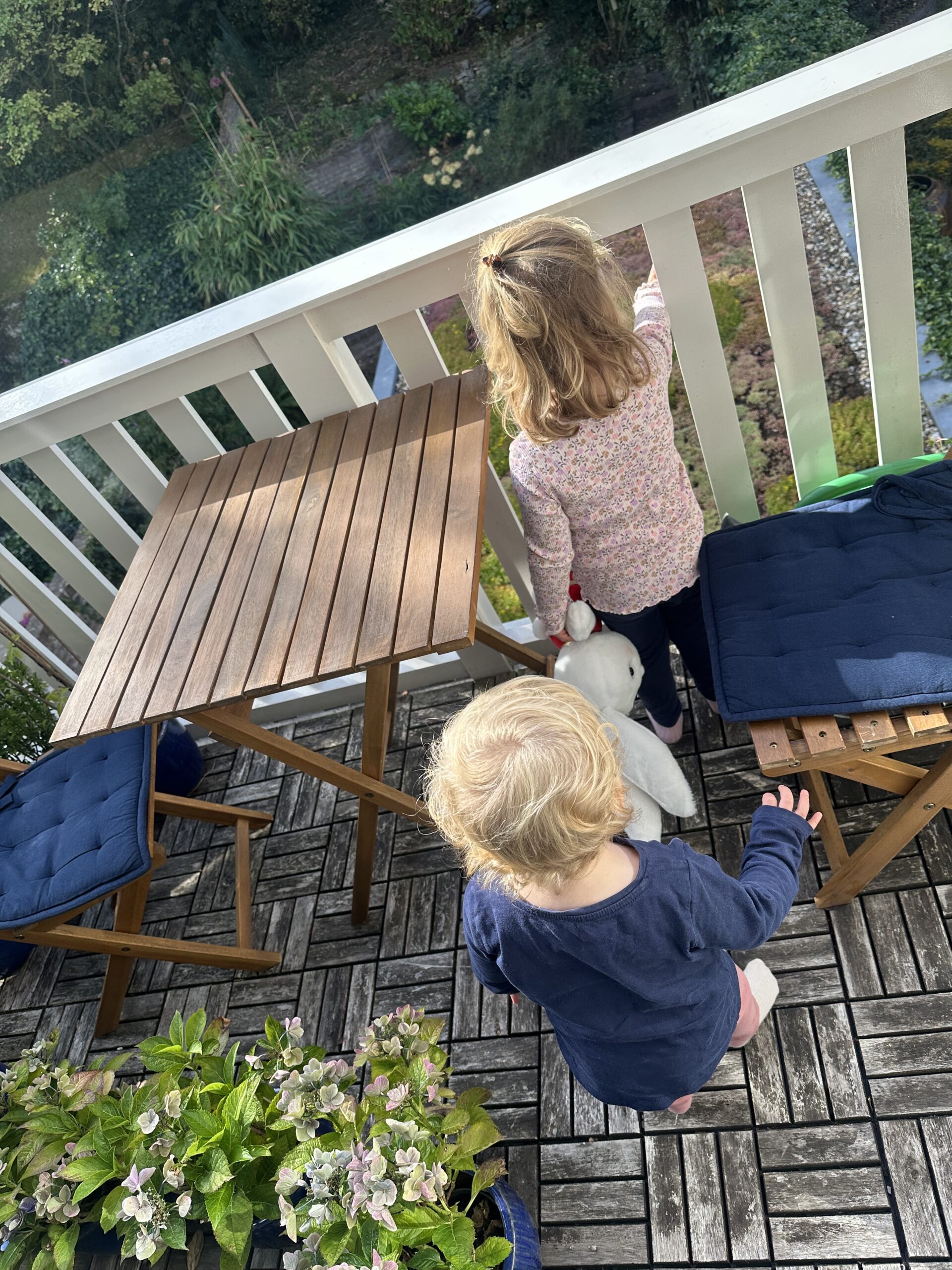Doe zondag in alle vroegte mijn ochtendwandeling. Loop een beetje om in de Scheveningse Bosjes. Heerlijk. Fiets nog snel naar de Keizerstraat voor een paar laatste boodschappen. Het is mijn oppasochtend. Even na negenen arriveert mijn zoon. Drinken gezellig buiten op het balkon bij de keuken een kop koffie en praten in alle rust bij. Tegen tienen schuiven mijn dochter, haar partner en Florien en Jolein aan. De meisjes (3 en ruim 1 jaar) klimmen met plezier de trap op (en af). Leuk samenzijn.