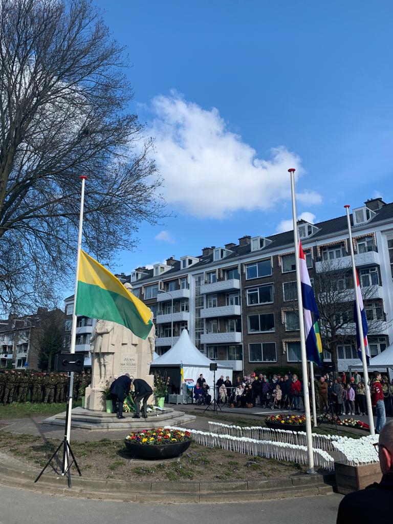 Ben in de loop van de ochtend aanwezig bij de herdenking van het bombardement op Bezuidenhout van 3 maart 1945. In het licht van de bevrijding werd de wijk per vergissing gebombardeerd door de Engelse luchtmacht. Het plan was de V2-installaties in het Haagse Bos te treffen. Niet deze installaties maar de wijk werd in het hart geraakt. Een groot deel van de wijk lag in het puin, honderden mensen lieten het leven of raakten gewond en tienduizenden verloren hun huis. De belangstelling voor de herdenking is groot, het is mooi georganiseerd en omlijst met muziek. Begroet ambtgenoot Jules Bijl (Leidschendam-Voorburg), loco-burgemeester Caroline Klaver (Wassenaar), wethouder Saskia Bruines en goede bekende Geert van Alkemade (jeugdige wijkbewoner in maart 1945). Jasmijn Derckx draagt een aantal fragmenten voor uit haar boek ‘Theodoor’. Ze schreef dit boek op basis van een van de grootste brievencollecties van Den Haag van de familie Van Ravenswaaij, die het bombardement in Bezuidenhout meemaakte. Samen met de zoon van Theodoor van Ravenswaaij – Boem van Ravenswaaij – legt Jasmijn een krans. Leg zelf namens het gemeentebestuur samen met Jan van der Poll, zoon van een brandweerman die het bombardement ternauwernood overleefde, een krans.