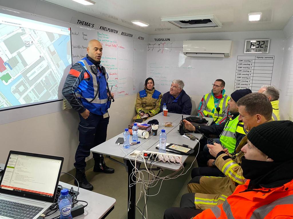 Rond half zes belt brandweercommandant Esther Lieben mij. Een zeer grote brand is gaande aan de Binckhorstlaan. Besluit mij ter plekke te laten informeren. De medewerkers Maayke Slim en Tristan Ober (directie veiligheid) leiden me samen met de commandant rond op het terrein. Zie eerst beelden van een drone die rondvliegt en een goed overzicht geeft van de situatie. Loop dan naar de ‘CoPi-bak’ (Commando Plaats Incident) waar om half zeven vertegenwoordigers van alle hulpdiensten in een korte vergadering de meest actuele stand van zaken opnemen.