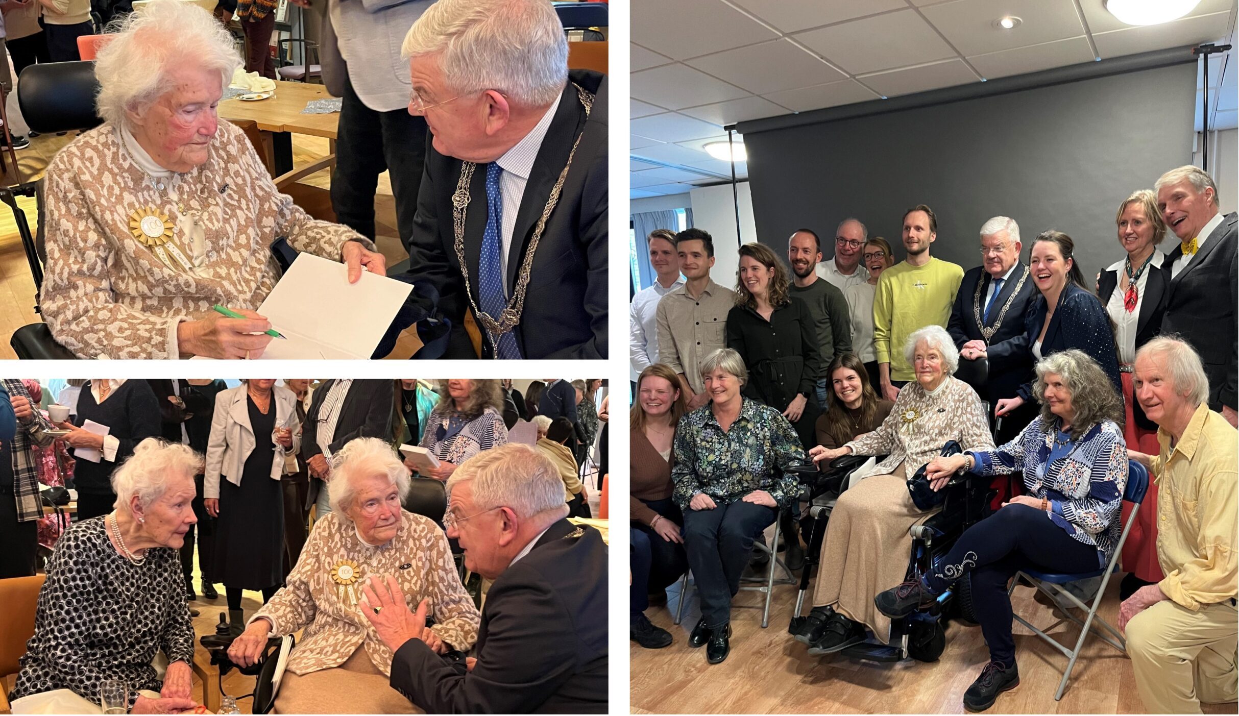 Stap zaterdagmiddag op de fiets. Breng een bezoek aan kapper Ap in de Prins Hendrikstraat. Dochter Georgina knipt me. Zwaai naar Sander Dekker, ook een klant. Fiets terug naar huis. Zie zwager bd Marten (breng hem groeten over van zijn oud-collega’s in den verre). Thuis gaat het pak aan. Stap opnieuw op de fiets. Wens in zorgcentrum Bosch en Duin aan de Scheveningseweg in een bomvolle benedenzaal Femke Groustra-de Kat van harte geluk met haar 100e verjaardag. De eeuwelinge blijkt vief en alert. Maak kennis met haar speciaal uit Engeland overgekomen zus Meike. Femke is geboren in Batavia en verbleef tijdens de Tweede Wereldoorlog in het Jappenkamp Tjideng. Na de oorlog ging zij rechten studeren in Leiden en leerde daar haar echtgenoot kennen. Van 1955 tot 1965 woonde zij in Toronto. Zij keerde na een scheiding met haar vier kinderen terug naar Nederland. Als alleenstaande moeder is zij tot haar pensioen werkzaam geweest bij het ministerie van Onderwijs en Wetenschappen. Ter gelegenheid van haar verjaardag schreef Conny Wittekoek-Wissink haar levensverhaal. Femke biedt mij een exemplaar van het 360 bladzijden tellende boek – live voorzien van een opdracht – aan. Eervol. Neem afscheid. Zoon Wilfred doet me in- en uitgeleide. Fiets naar huis.