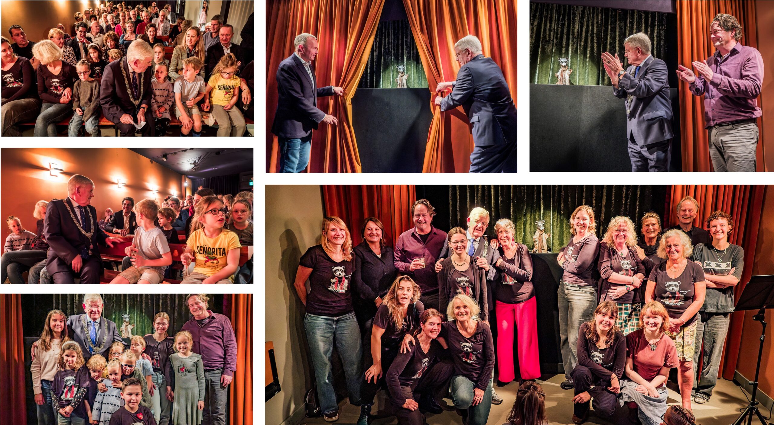 Maak ook zondag in alle vroegte een ochtendwandeling door de wijk. Bel zeer uitvoerig met mijn broer Koos en (kort) met toekomstige benedenbuurman Eugène. Draag in de loop van de middag in de Frankenstraat bij aan de onthulling van een bronzen beeldje ter gelegenheid van het 65-jarig bestaan van Kooman’s Poppentheater. Fiets erheen. Carola (kabinetszaken) begeleidt me. Arjan Kooman, poppenspeler en directeur, en Mark Lindeman, voorzitter van de stichting Vrienden van Kooman´s Poppentheater, begroeten me bij de voordeur van het theater. Zo´n 70 genodigden, waaronder een groot aantal kinderen, nemen plaats op de bankjes. Zit op de voorste rij tussen allerlei vrolijke kleuters in. Een jongetje naast me vraagt heel vriendelijk: “Wat komt u hier doen?” Het meisje aan de andere kant antwoord als ik vraag waarom ben je zo stil: “Burgemeesters zijn altijd zo streng.” Kan haar geruststellen. Kortom, voel me (redelijk) welkom. Geintje. Er is een korte voorstelling: een reis door de 65 jaar van het theater heen. Wasco de Wasbeer, symbool van het poppentheater, presenteert de voorstelling. Spreek na een welkomstwoord van Berber, echtgenoot van Arjan, en vriendenstichting voorzitter Mark Lindeman, het publiek, de kinderen en (oudere) kinderen, de vrijwilligers en de theatermakers toe. Onthul na afloop met Arjan en Mark het bronzen beeldje van Wasco. Maker Marlieke Schoorl kan trots zijn. Lambert de Jong maakt foto’s en Haagse Dingen een videoverslag.