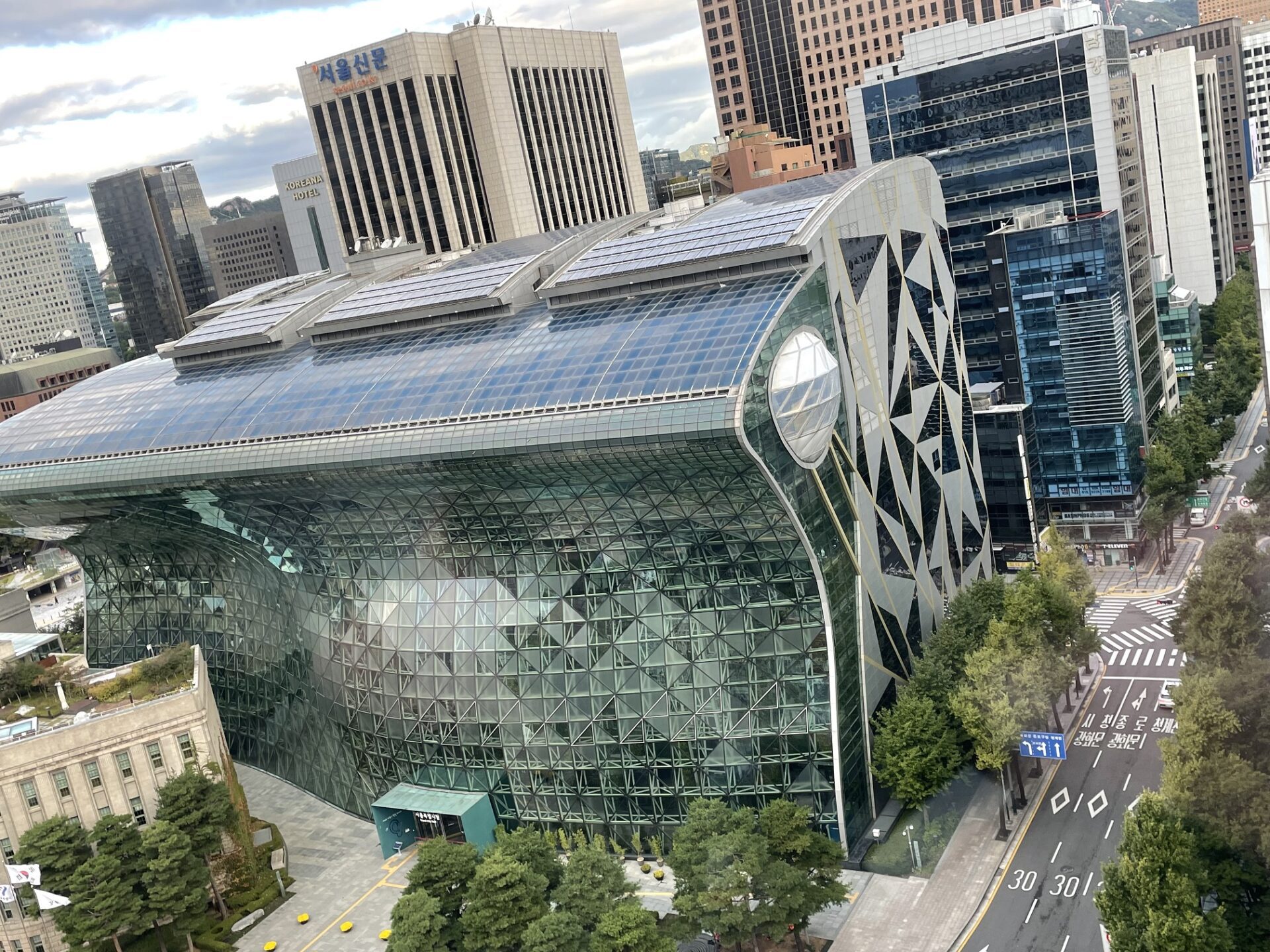 Zie het voor het eerst. Toen ik november 2010 in het nabijgelegen Westin Josun hotel verbleef stond het (nieuwe) Stadhuis nog in de steigers. In 2012 ging het gebouw open. Nu ziet het er fraai uit. Ga onder de douche. Wandel met de delegatie naar een nabijgelegen eethuisje. De naam kan ik niet kan lezen. Gebruiken er het avondeten. Soep met groenten, rijst en rundvlees. Smaakvol.